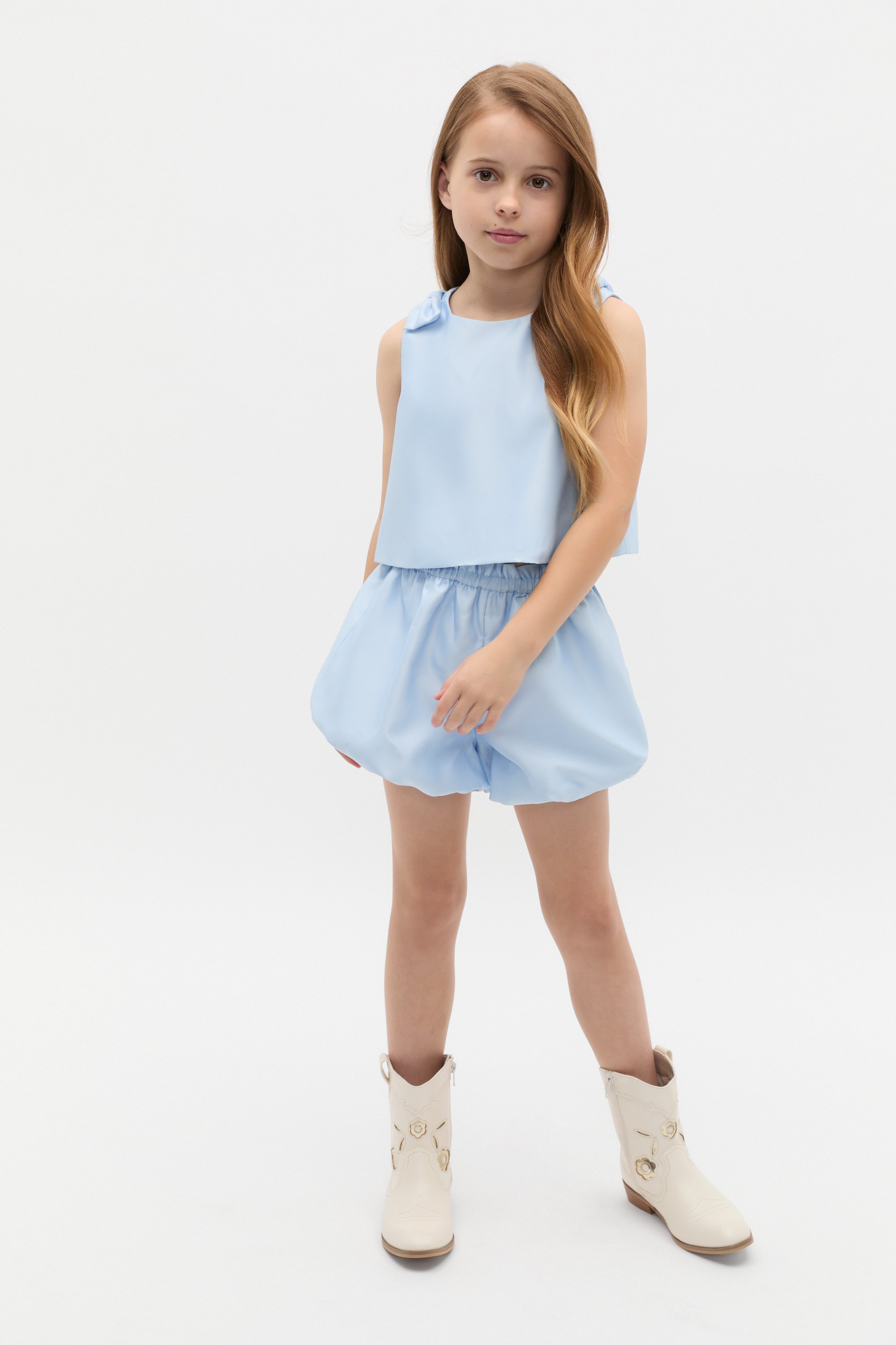 This statement pair of shorts are a comfortable style for dressier occasions. Finished all in satin, they feature an elasticated waistband with an elasticated hem to make a sweet bubble shape. Pair with the coordinating satin top to complete her party look.