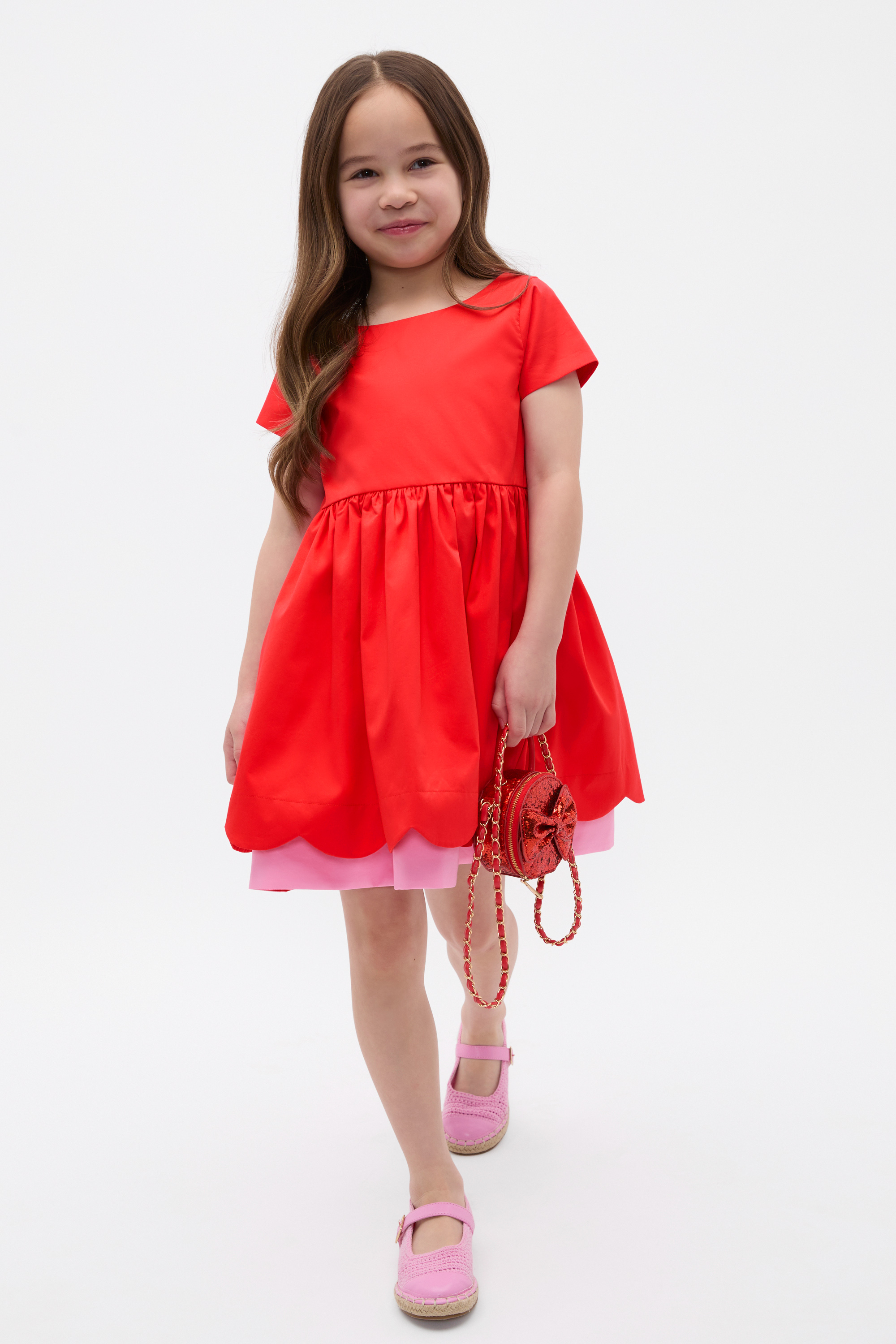 So special and sweet, this dress is perfect for festive occasions and parties over summer. Crafted in premium cotton with a polished effect, it features a round neck, short sleeves and a statement bow at the back, fastening with an invisible zip. It has a two-tone design embellished with a scallop trim detail.