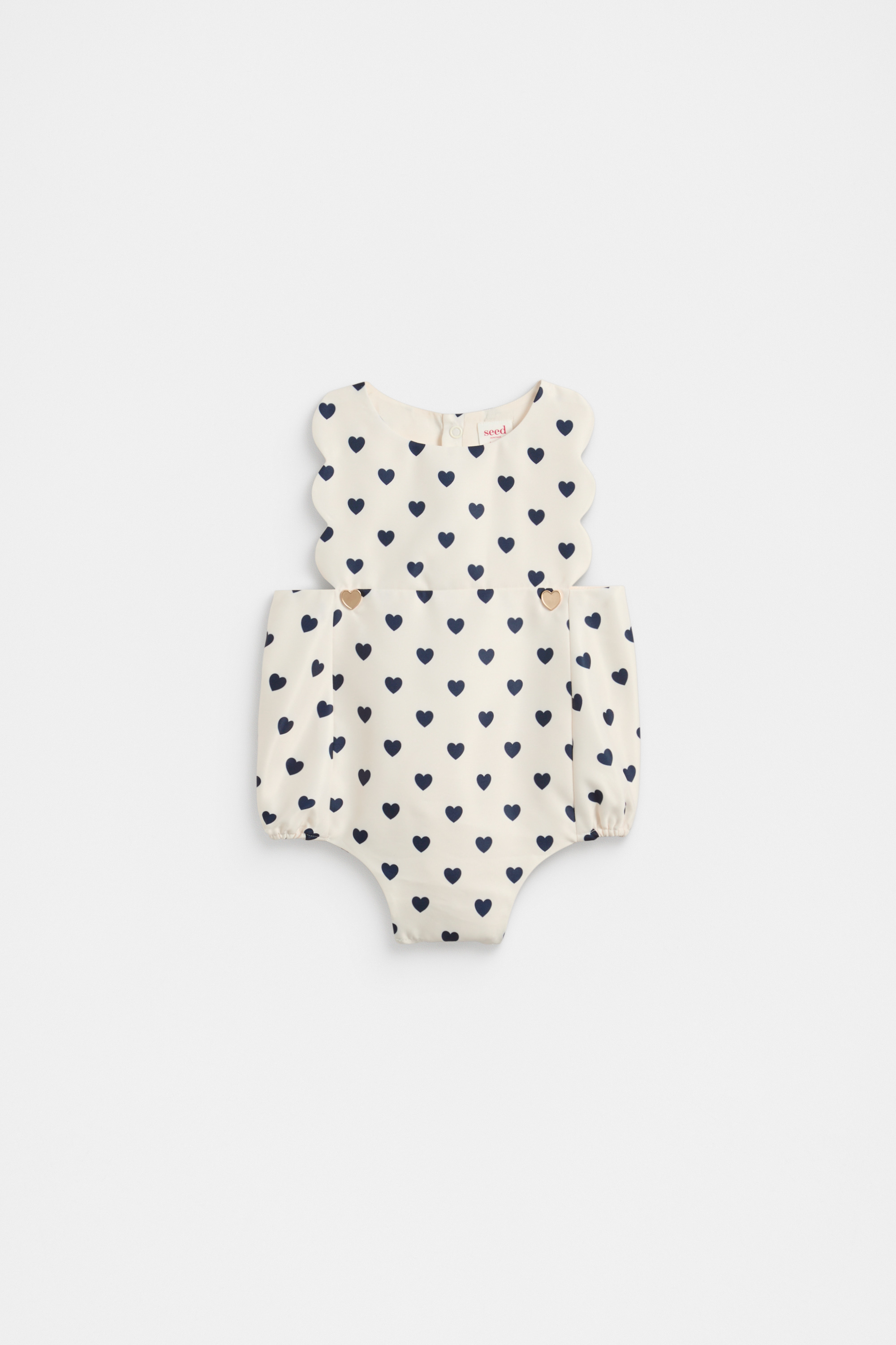 Adorably sweet and stylish, this romper is perfect to dress her up for special occasions. Finished in satin, it features a round neck, scallop trim details, soft gold heart-shaped buttons and an all-over heart print. For quick and easy changes, it secures at the back with buttons and has elasticated leg openings and gusset buttons.