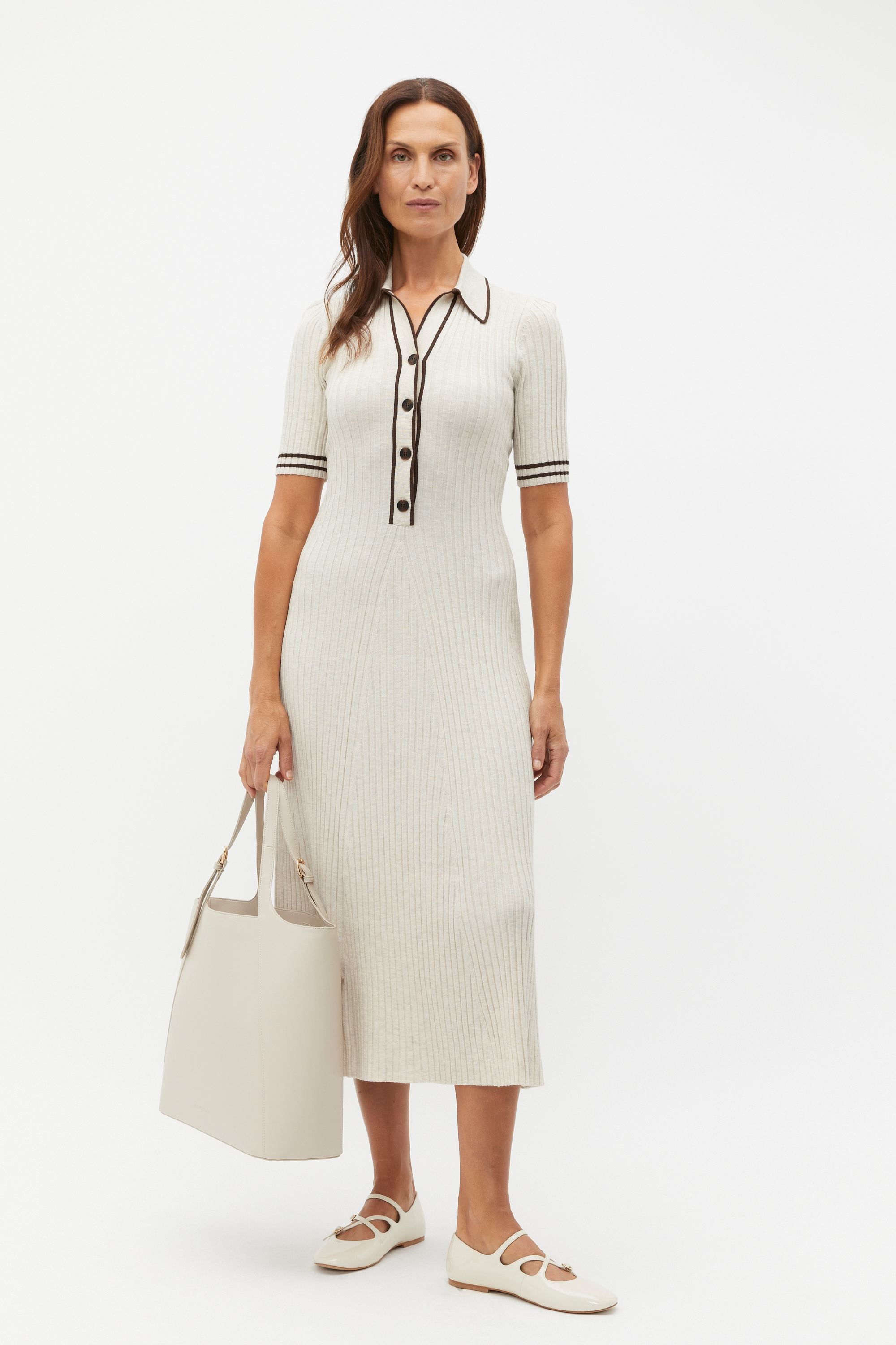 A classic style for the contemporary wardrobe, this dress is ideal to elevate your summer outfitting. Crafted in a lightweight blend with a neat stretch fit, it features an open button collar, short sleeves, and a subtly flared skirt that falls to a midi length. It has a knit finish and contrast tipping details.