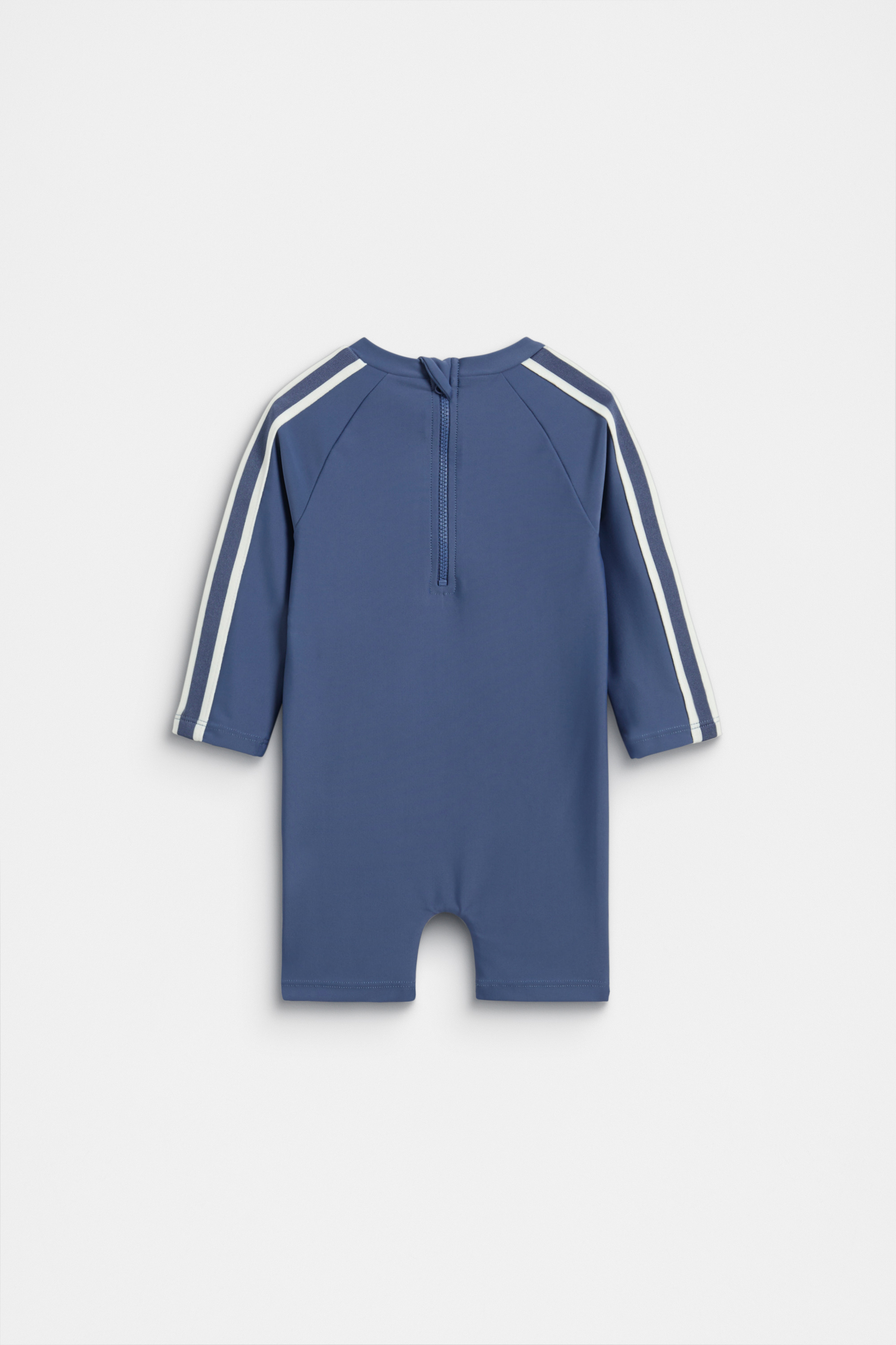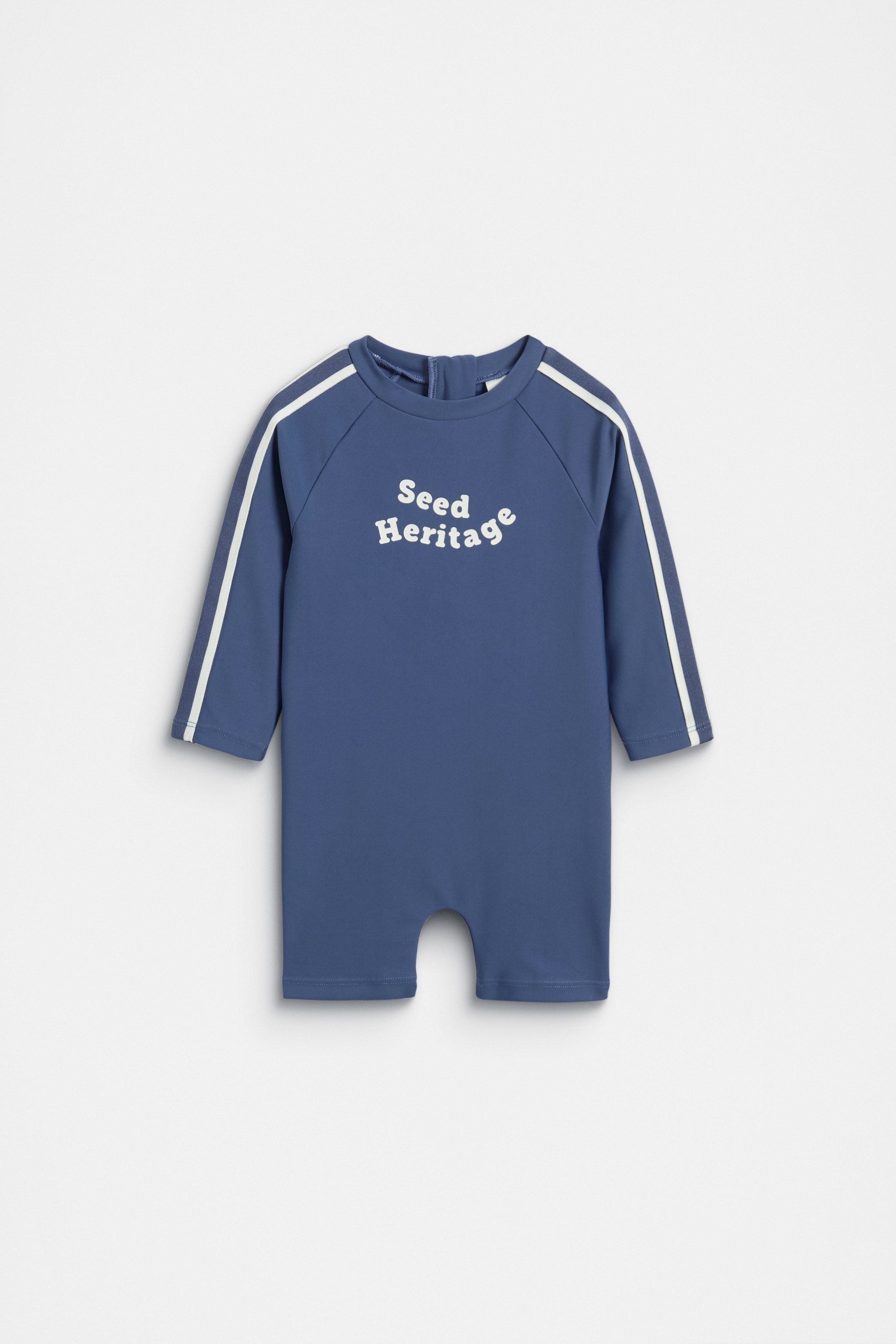 Ideal for all his water-play adventures, this little rash suit is the perfect summer-ready style. Crafted in a comfortable stretch nylon blend, it features a round neck, long raglan sleeves with a stripe design and a Seed Heritage logo across the front. Secures at the back with a zip.