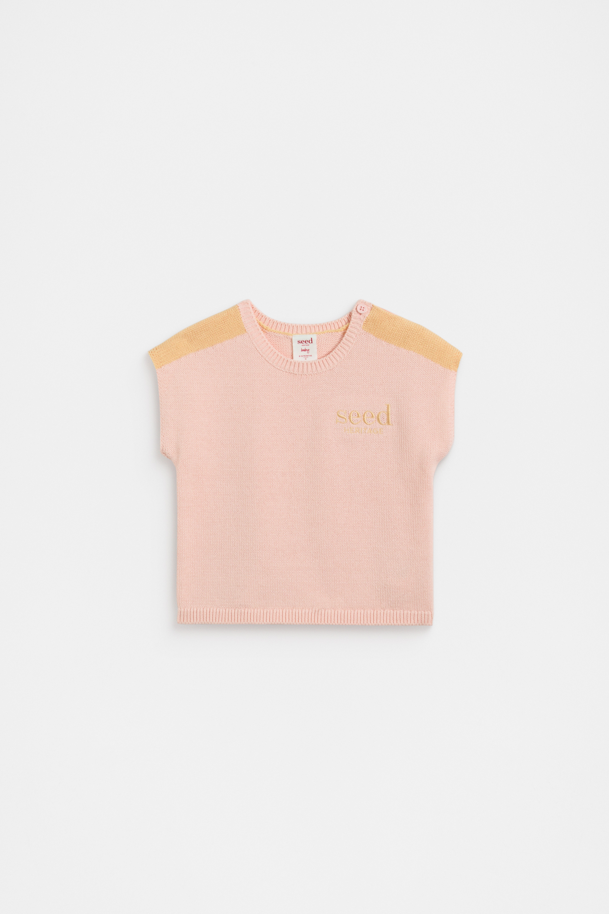 So soft and sweet, this little tee has a knit finish and a colour-splice design to guarantee cuteness. Crafted in premium cotton, it features a round neck, short sleeves, an embroidered Seed Heritage logo and a shoulder button for ease and convenience when changing. Pair with the matching knit shorts for the cutest head-to-toe set, or for the perfect gift.