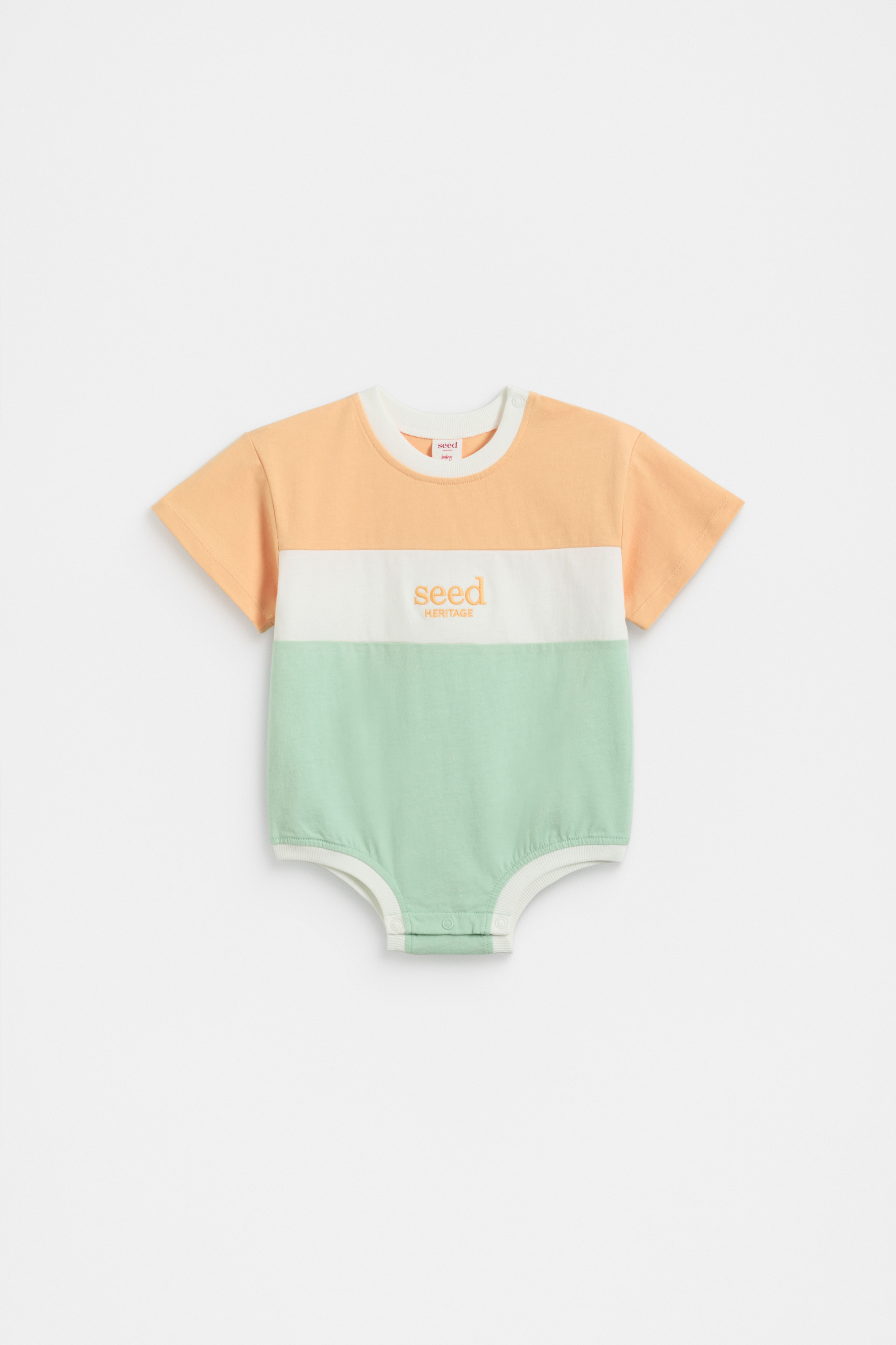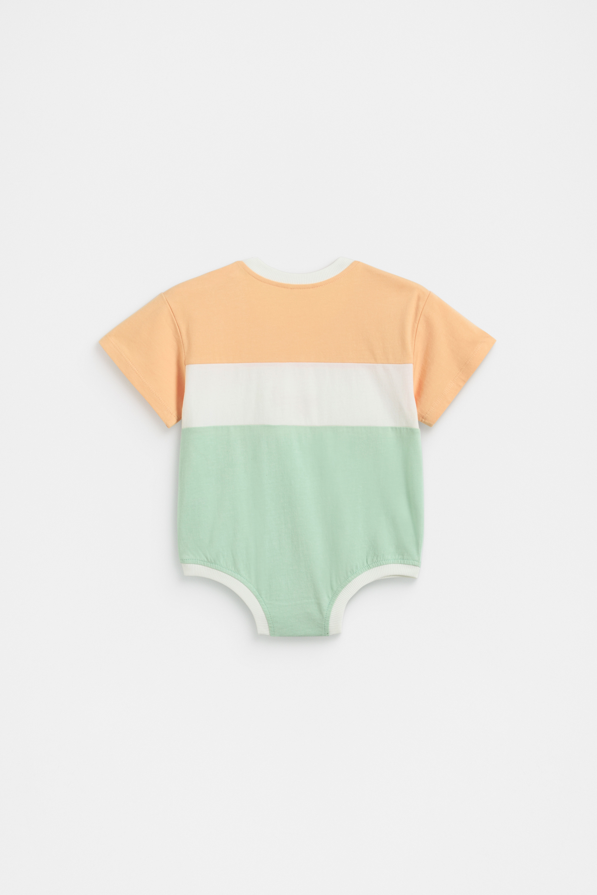 So soft and cosy, this little bodysuit is an oversized style for maximum cuteness. Crafted in premium cotton, it features a round neck, short sleeves and loose-fitting leg openings. It's finished with a colourblock design in the sweetest pastel palette. For quick and easy changes, it also has snaps at the shoulders and gusset.
