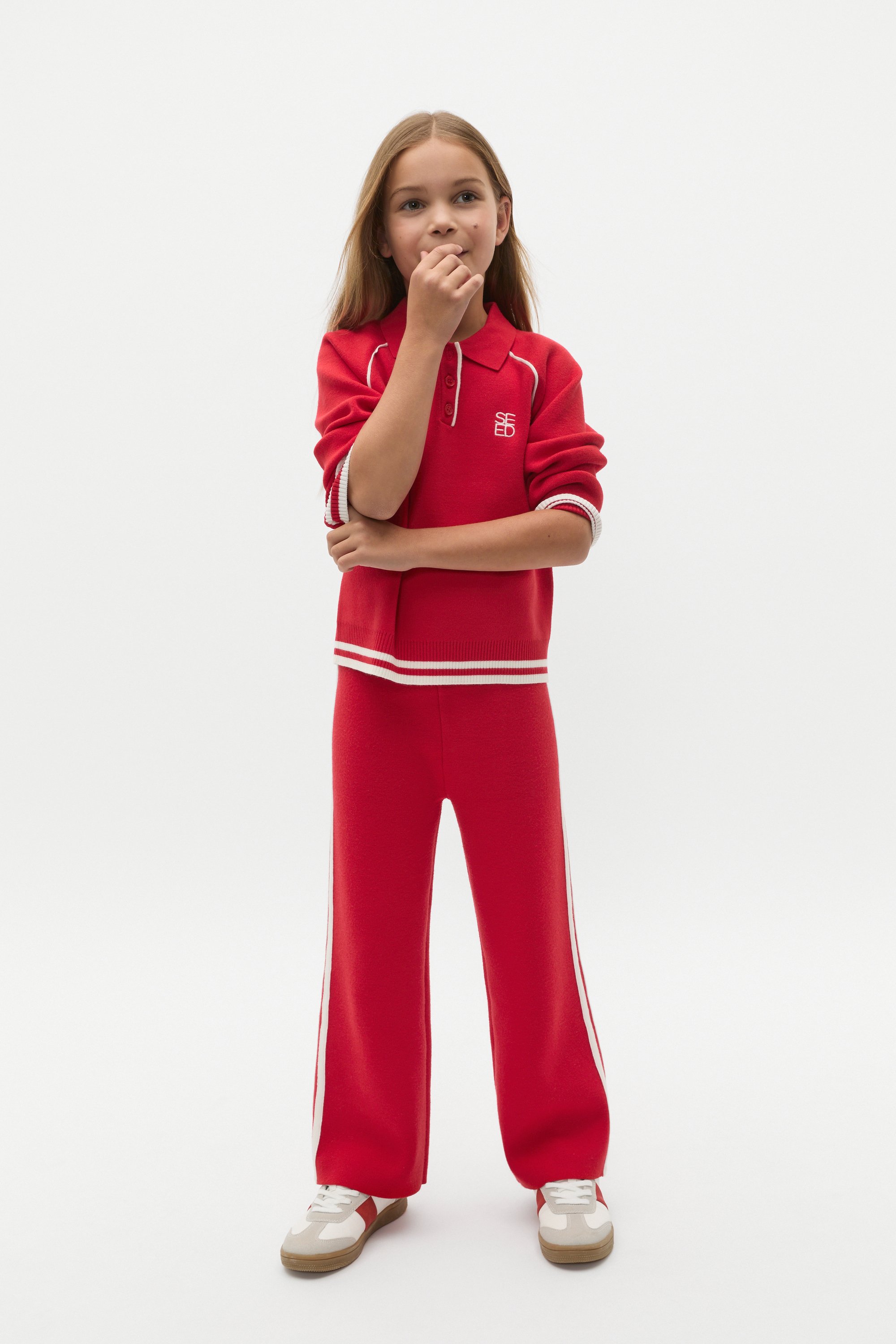 A sporty and chic design for her little wardrobe, this sweater is finished in a subtly textured boucle, perfect for to dress up or down. It features a button-up collar, long sleeves and stripe details at the trims. Pair with the coordinating boucle knit pants for the sweetest head-to-toe set.