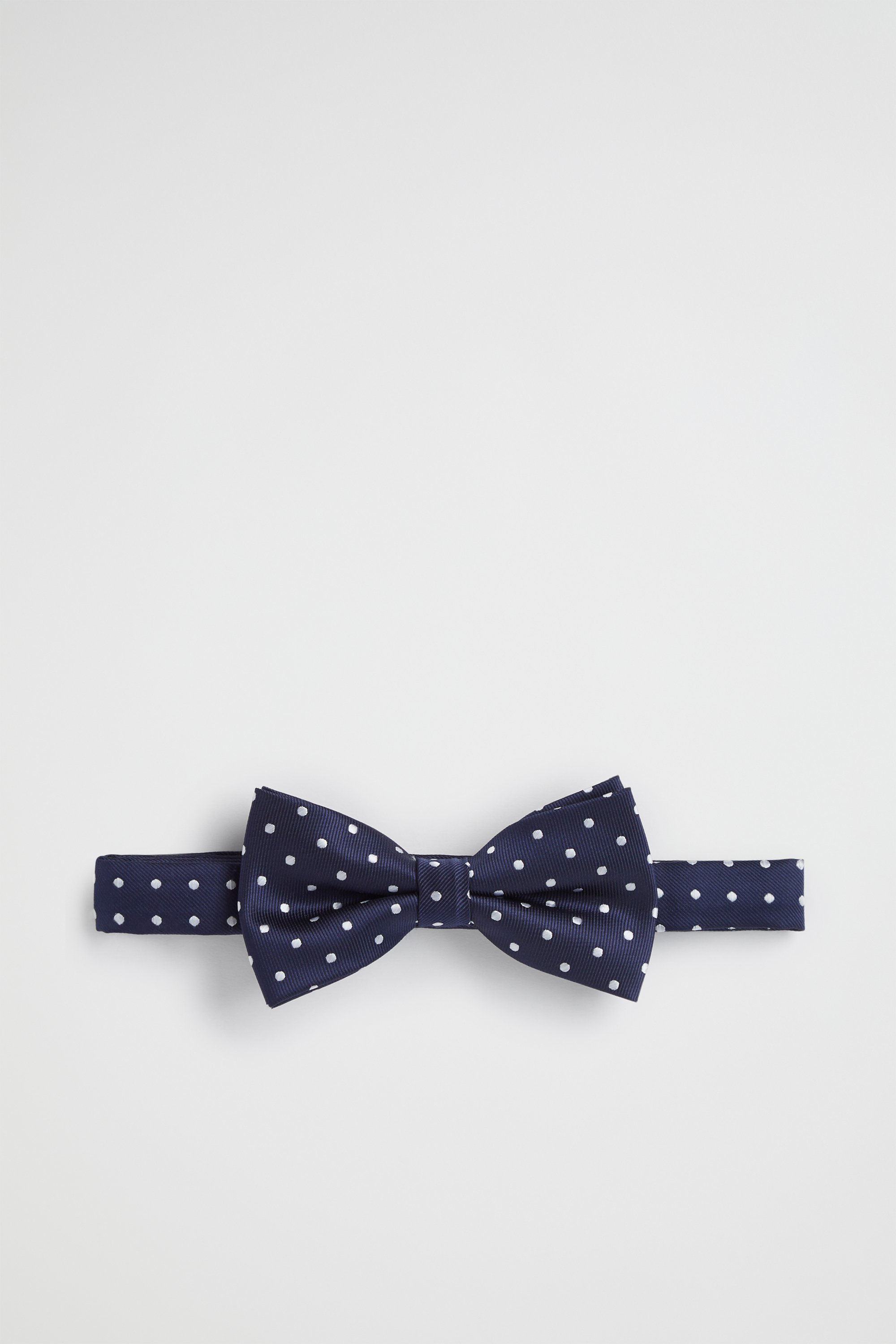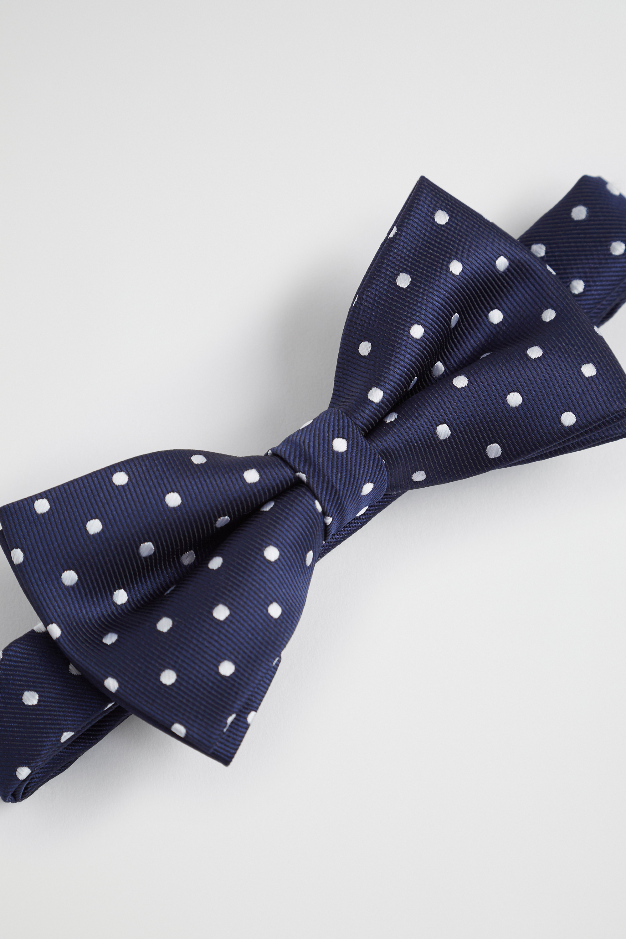 Smarten up any look with this stylish bow tie. Covered in white polka dots that stand out against the navy base, this 100% cotton bow tie effortlessly accessorises any outfit.