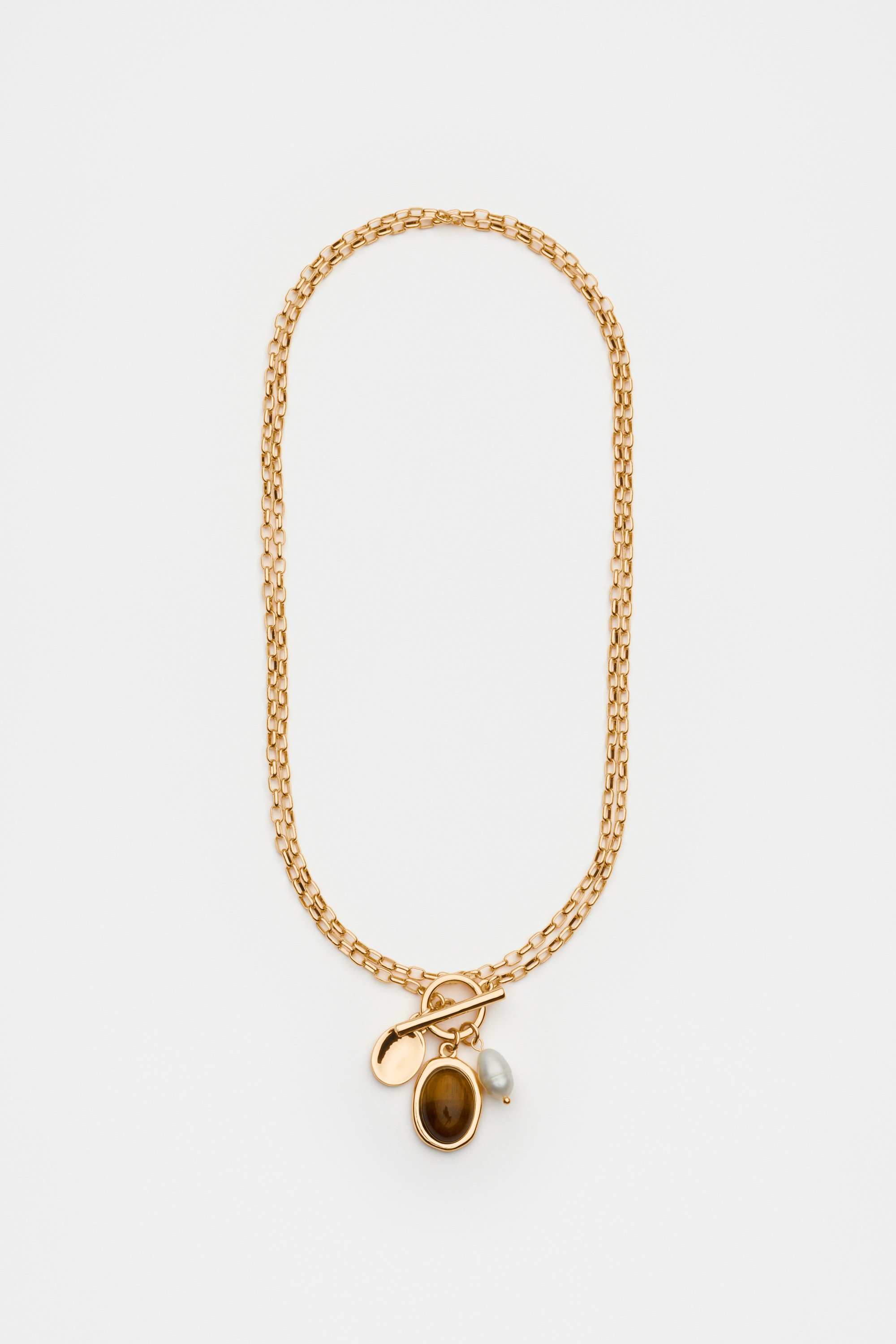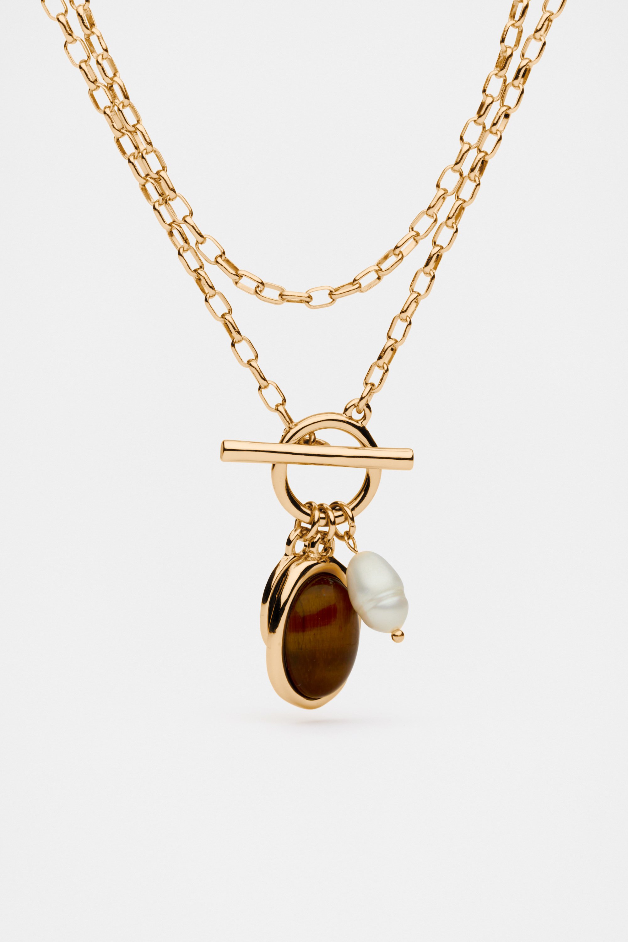 Refresh your accessories styling with this necklace, detailed with a semi-precious tigers eye and a freshwater pearl. With an adjustable chain, it can be worn short or long.