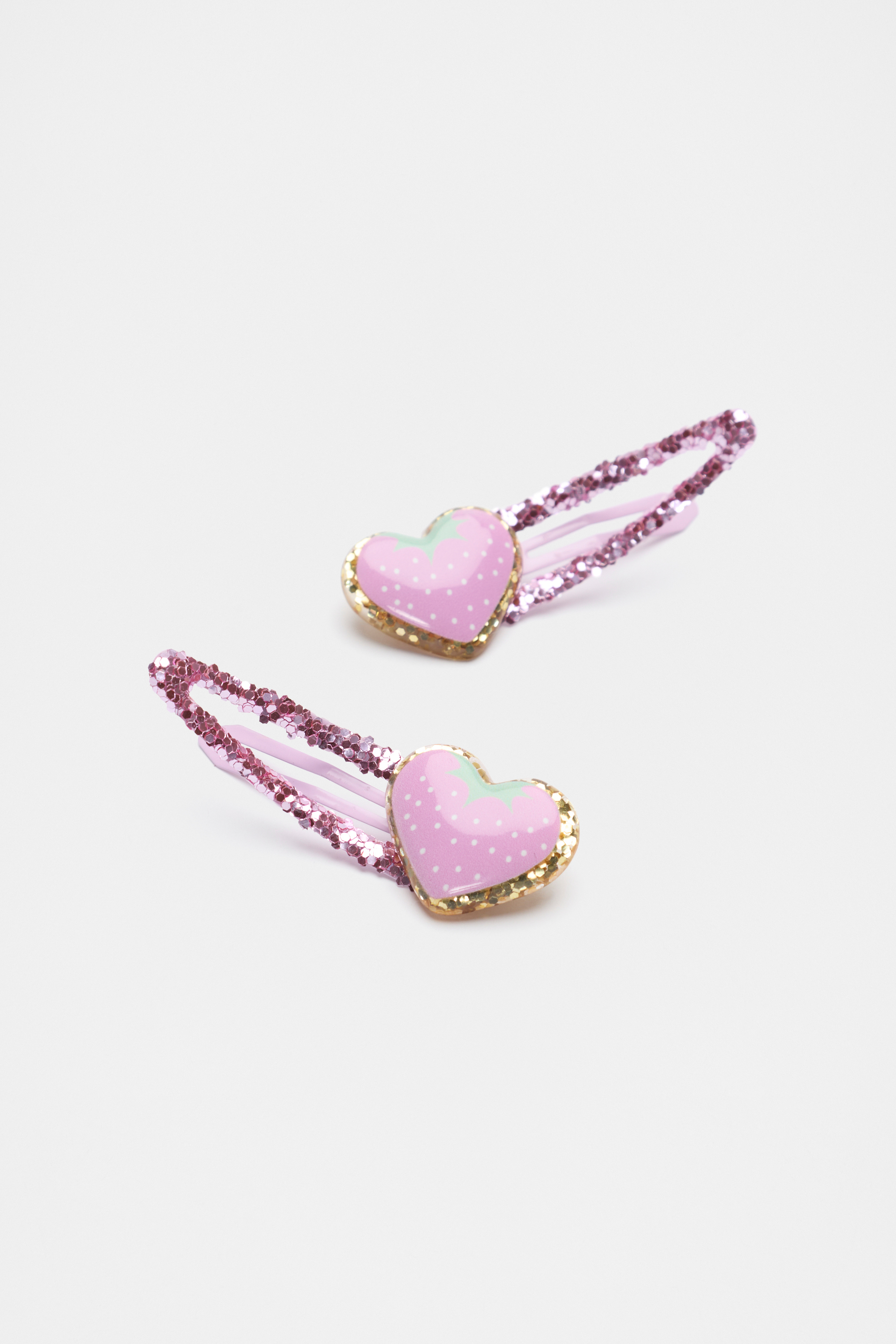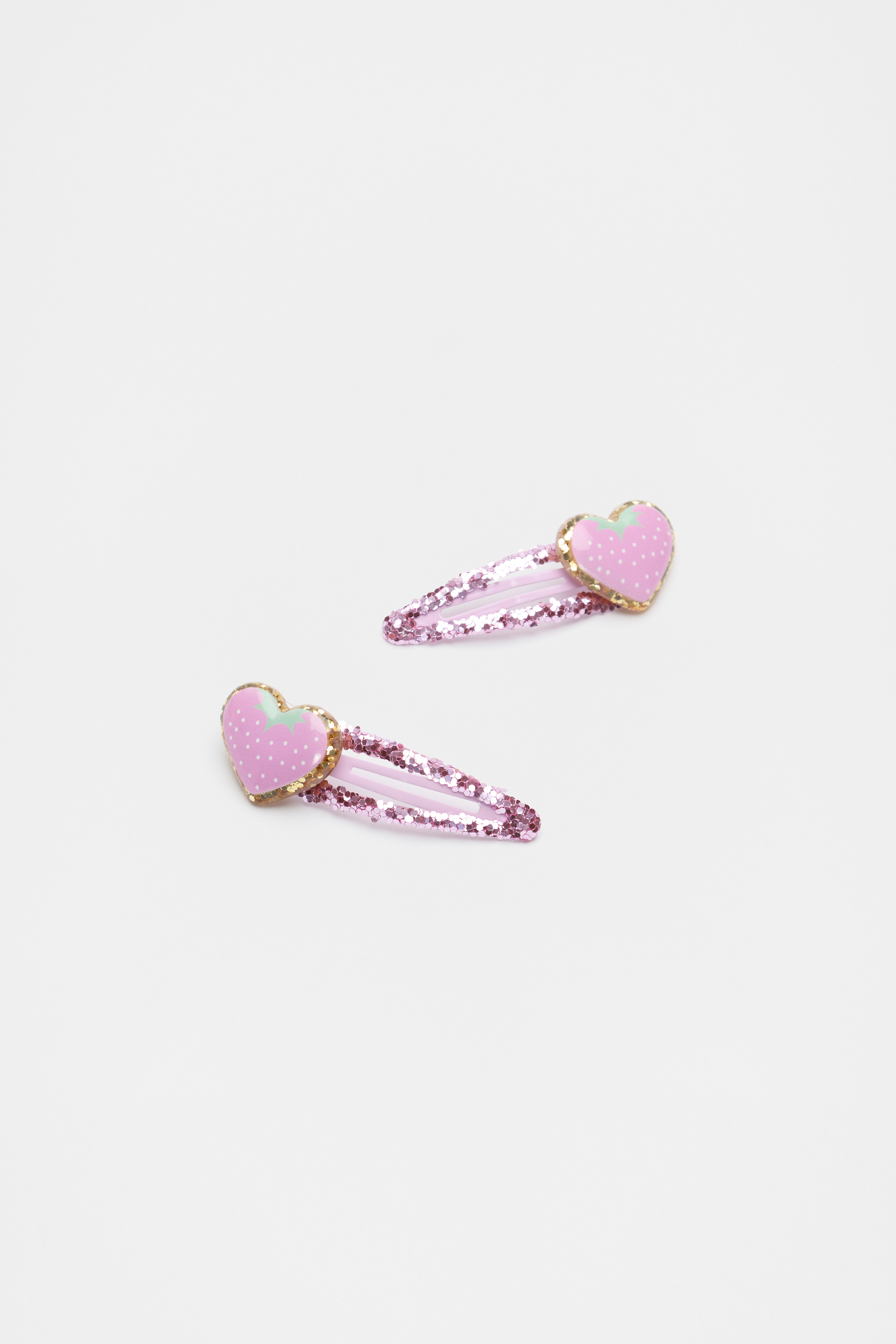 Sparkly and cute, this duo features two glittery hair snaps with strawberry hearts. This product is not a toy and is not suitable for children three years and under.