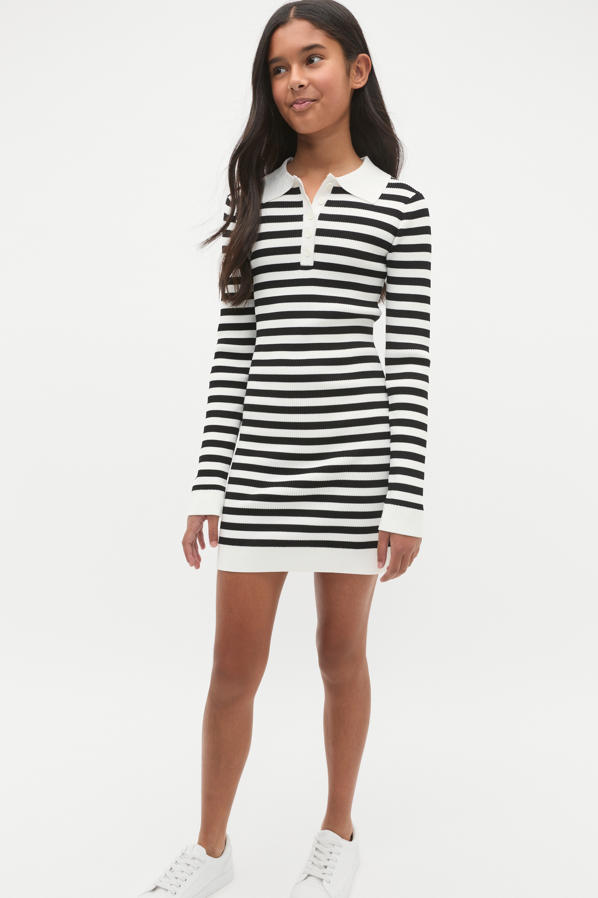 Easy to dress up or down, this knit dress is an effortlessly chic style. Crafted in a soft and stretchy blend, it features a collar with a button placket, long sleeves and a timeless stripe design.