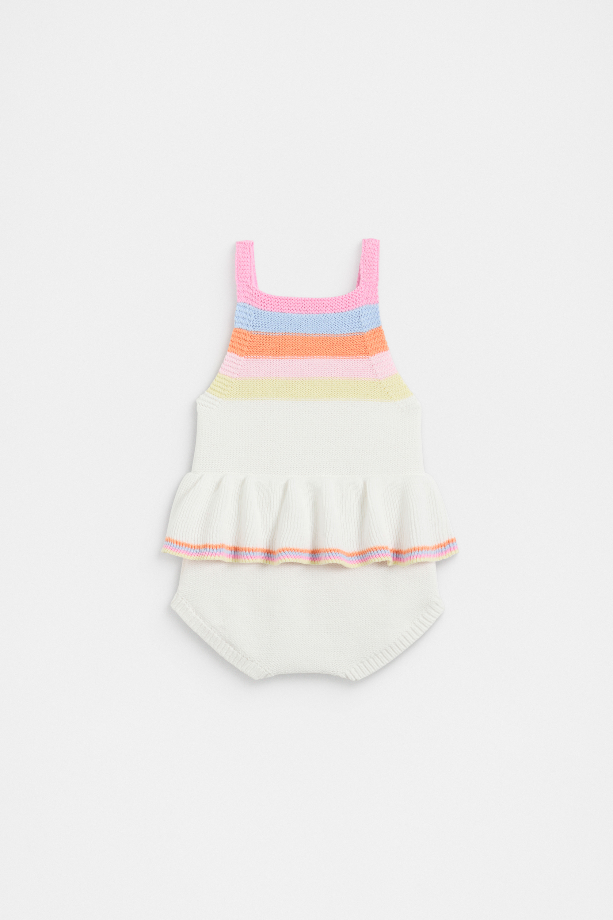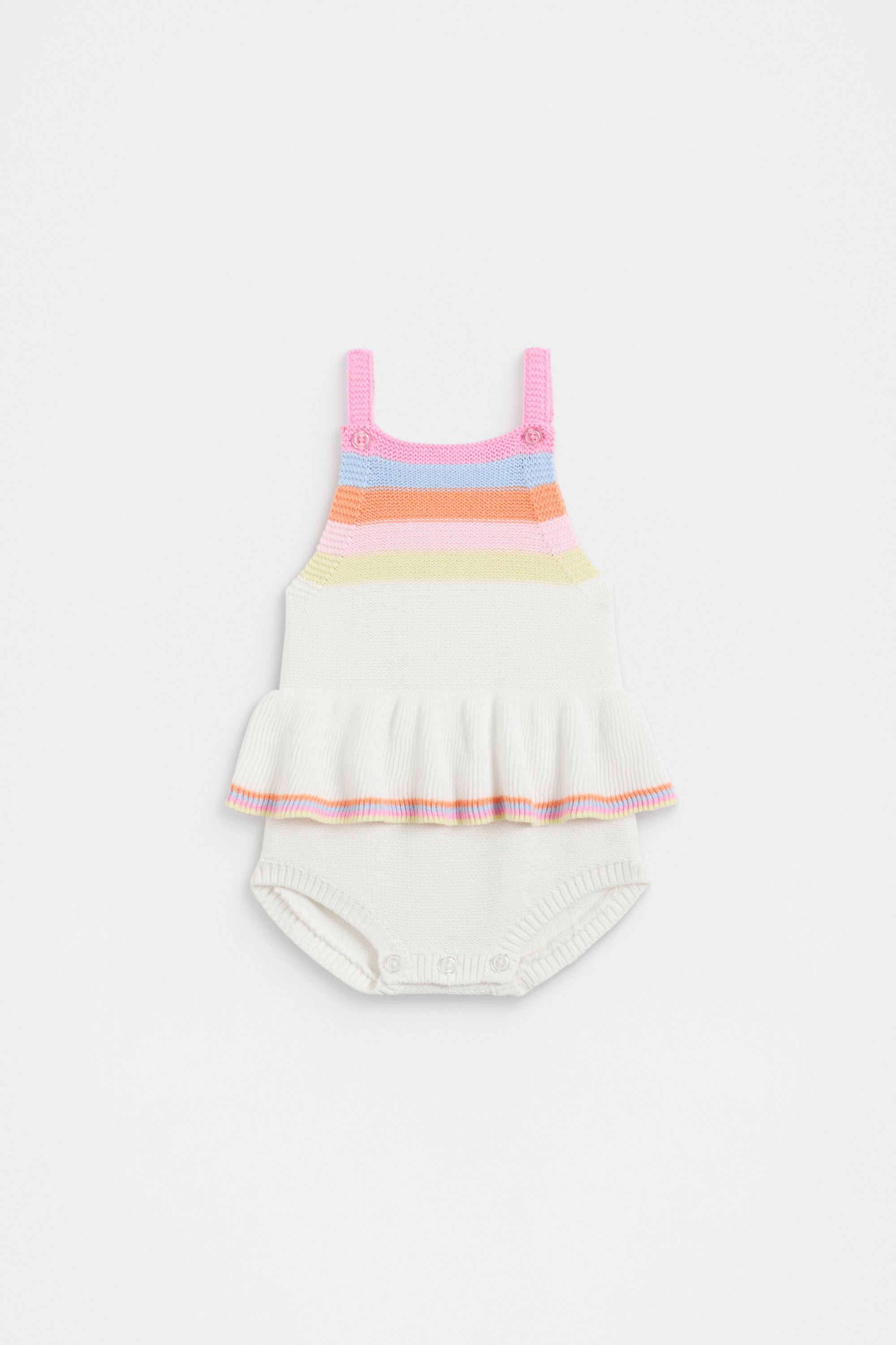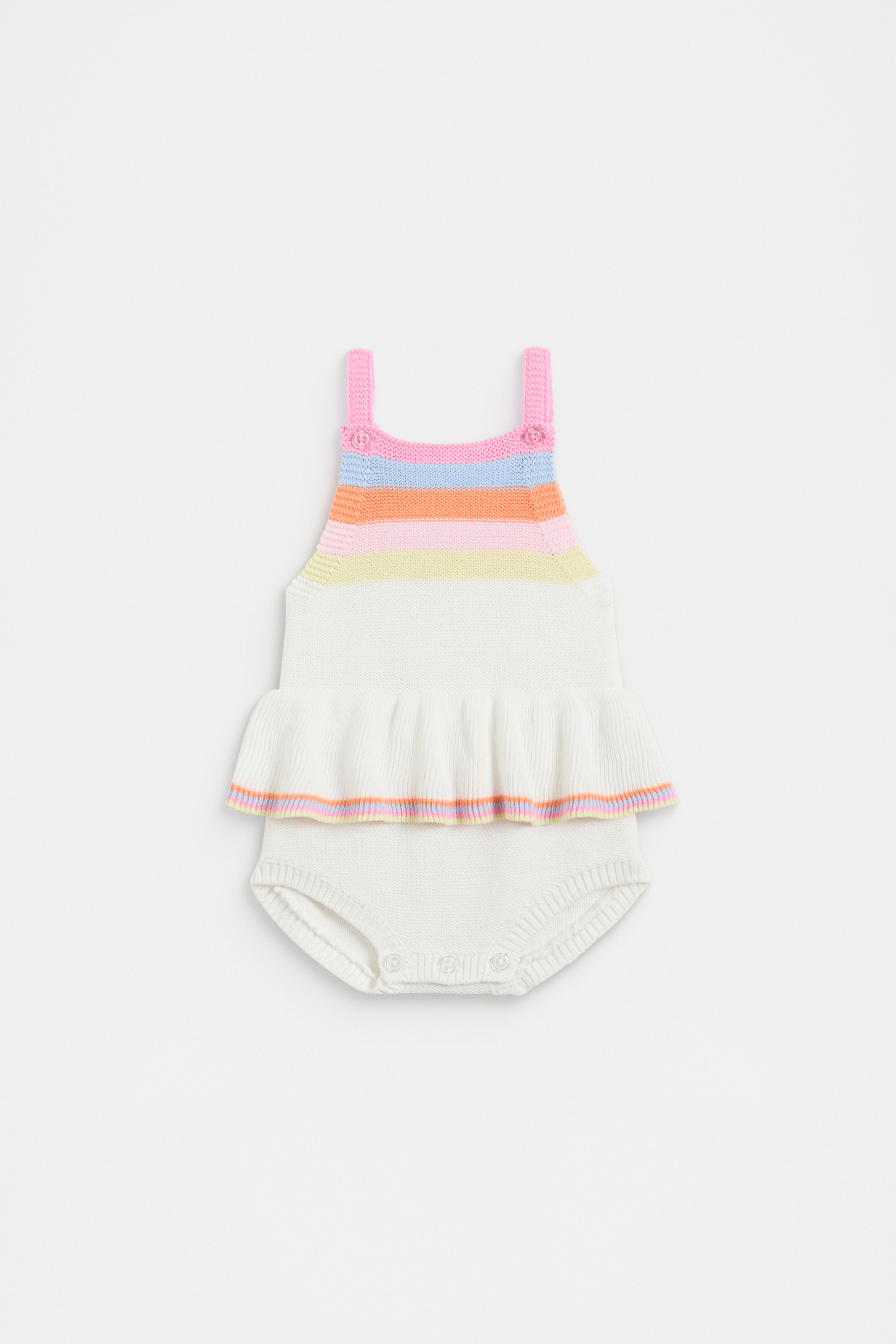 Playful and bright, this stripey romper is a cheerfully colourful design. Crafted in a premium cotton knit, it features adjustable straps, a frill skirt and buttons at the gusset for ease and wearability.