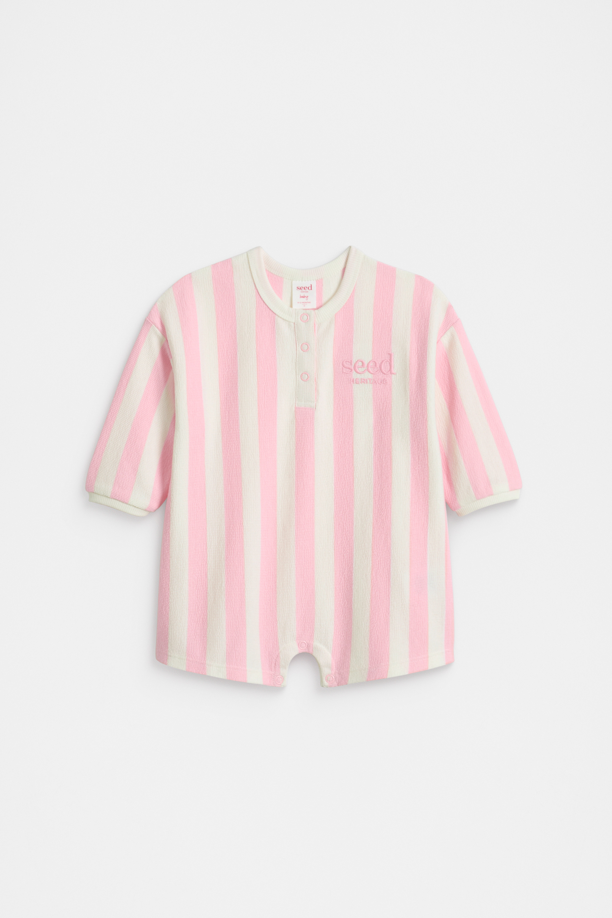 Adorably finished in a candy stripe, this jumpsuit is a relaxed style for everyday comfort. Crafted in a stretch cotton blend, it features a round neck, long sleeves and an embroidered Seed Heritage logo. It buttons up at the neckline and has snaps at the gussets for quick and easy changes.