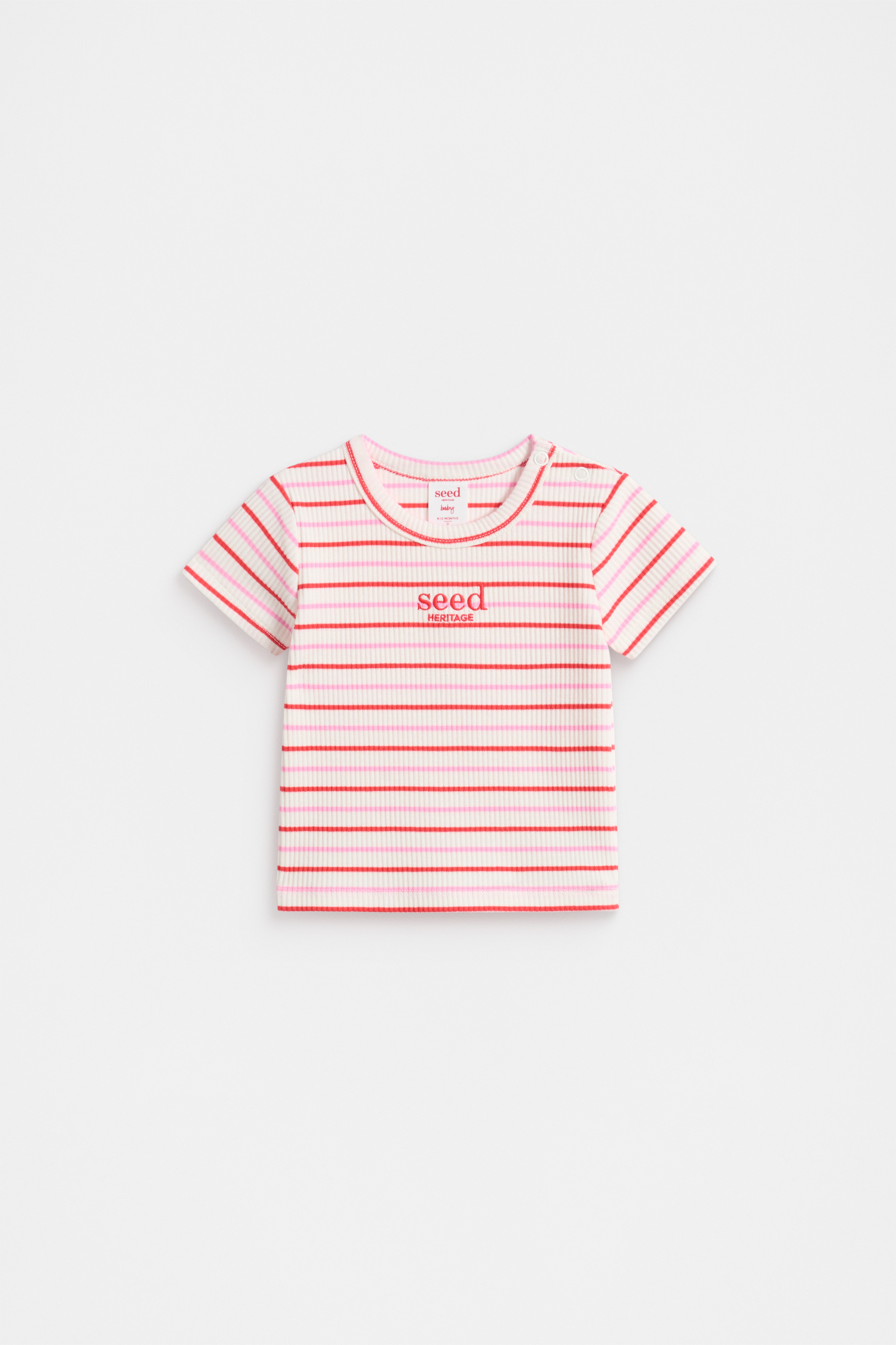This classic style is perfect for everyday wear, one you'll reach for on repeat. Crafted in a premium stretch cotton blend, it features a round neck, short sleeves, a stripe design and an embroidered Seed Heritage logo. For quick and easy changes, it also has snaps at the shoulder.