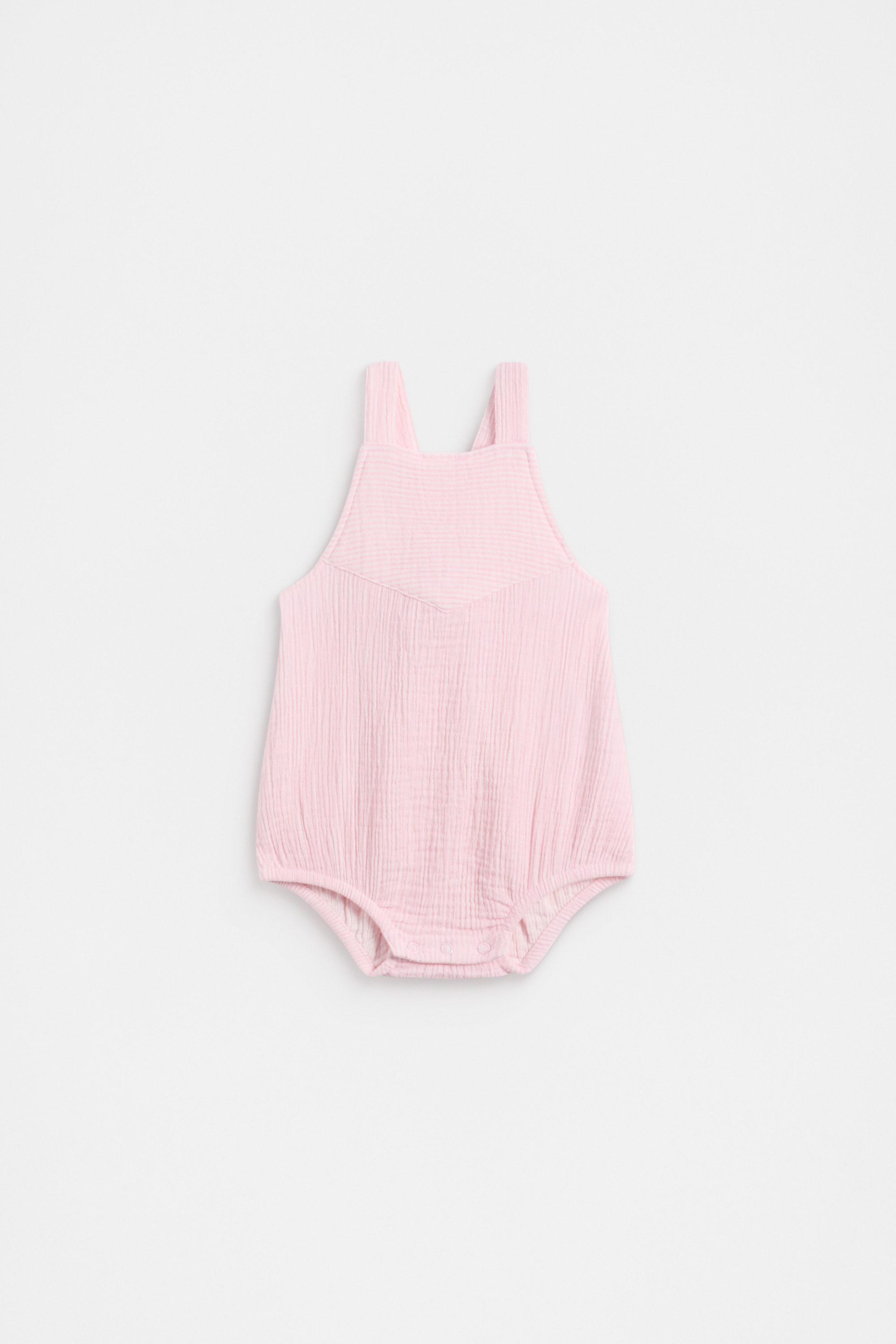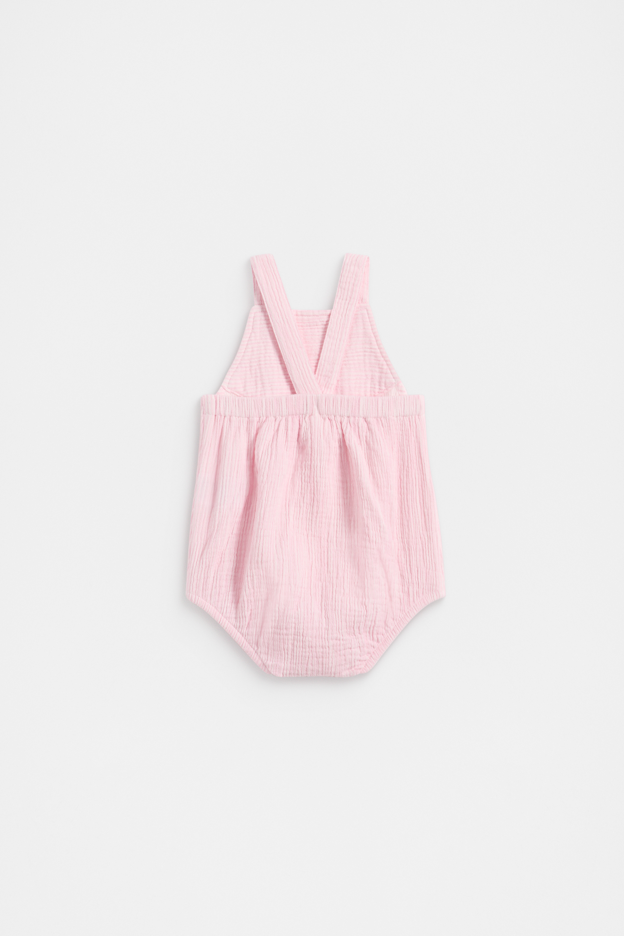 Crafted from textured cotton with a sweet stripe, this romper is ready to be worn again and again. It features cross-over straps with two length options, a straight neckline, elastic at the leg openings, and snaps at the gusset.