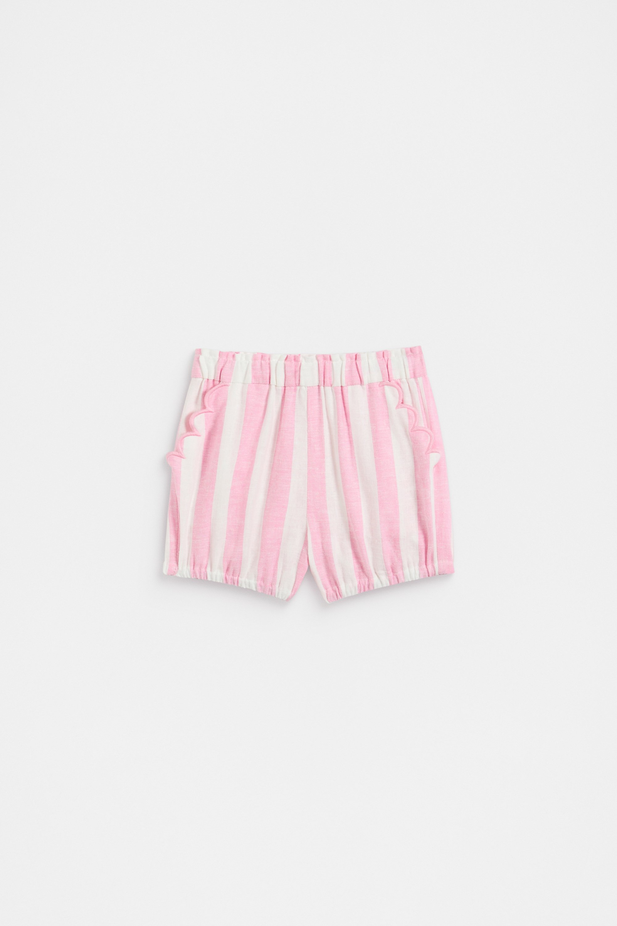 These stripey bloomers are a handy pair for everyday cuteness. Crafted in a lightweight blend containing linen, they feature an elasticated waistband, pockets with a scallop trim and elasticated leg openings for comfort and ease. Pair with the matching top for the most adorable head-to-toe set.