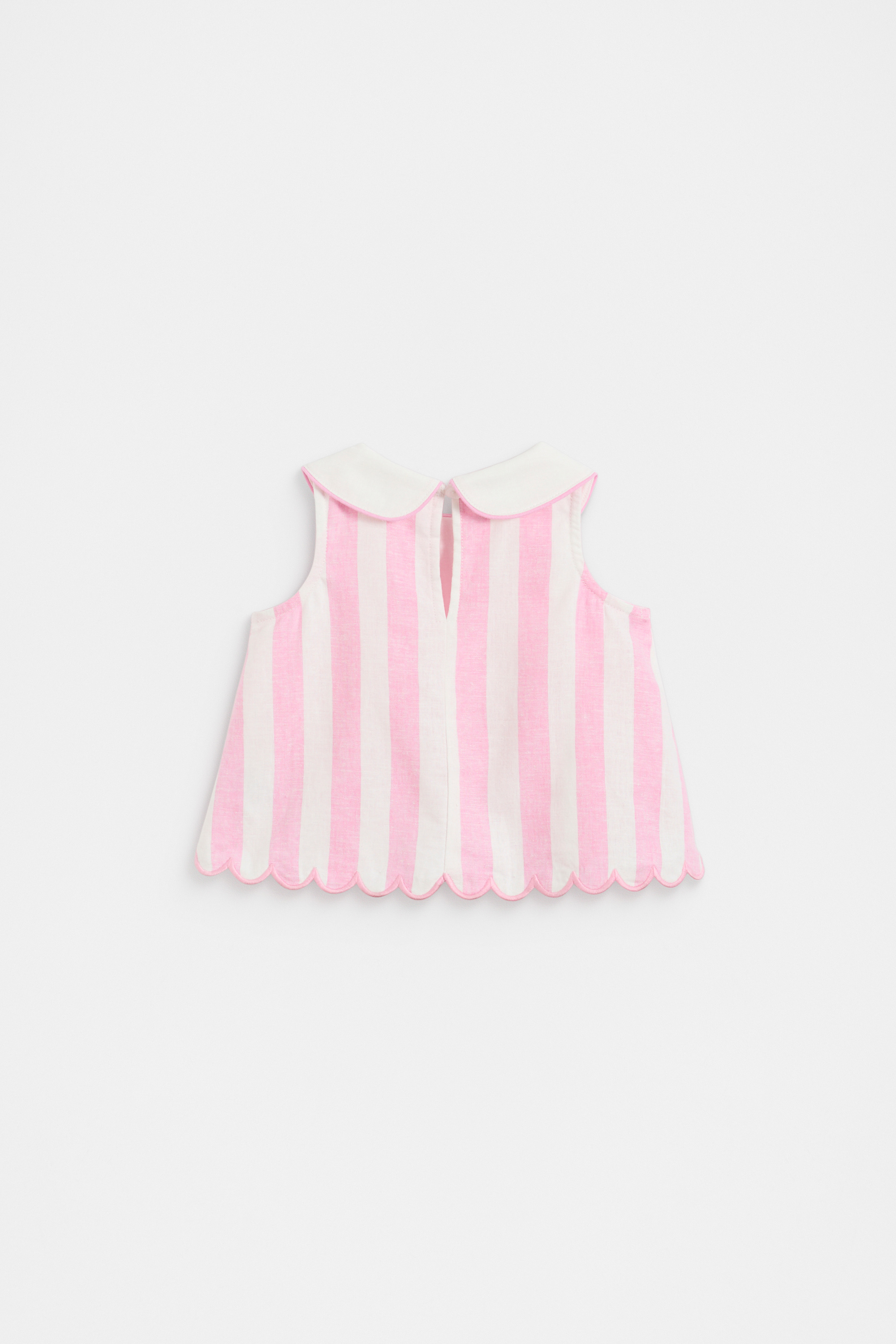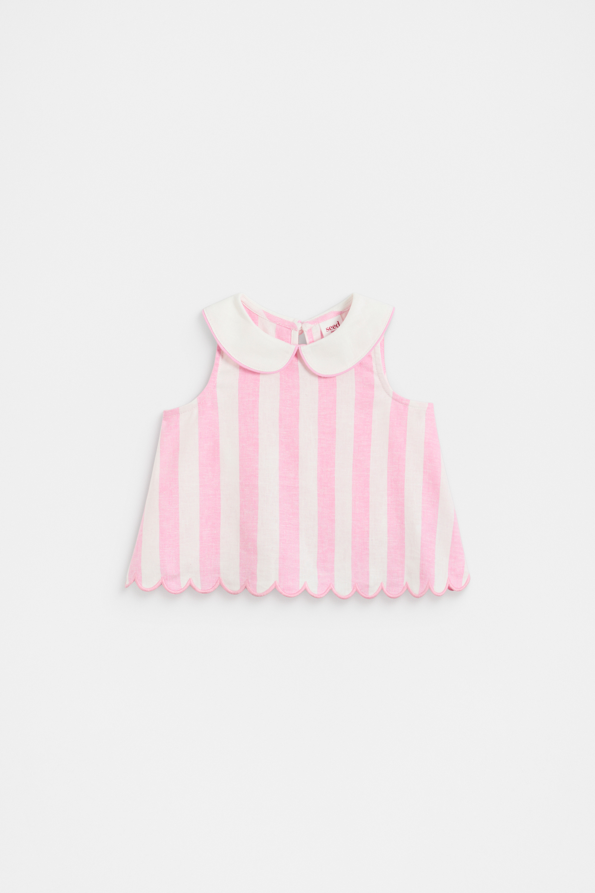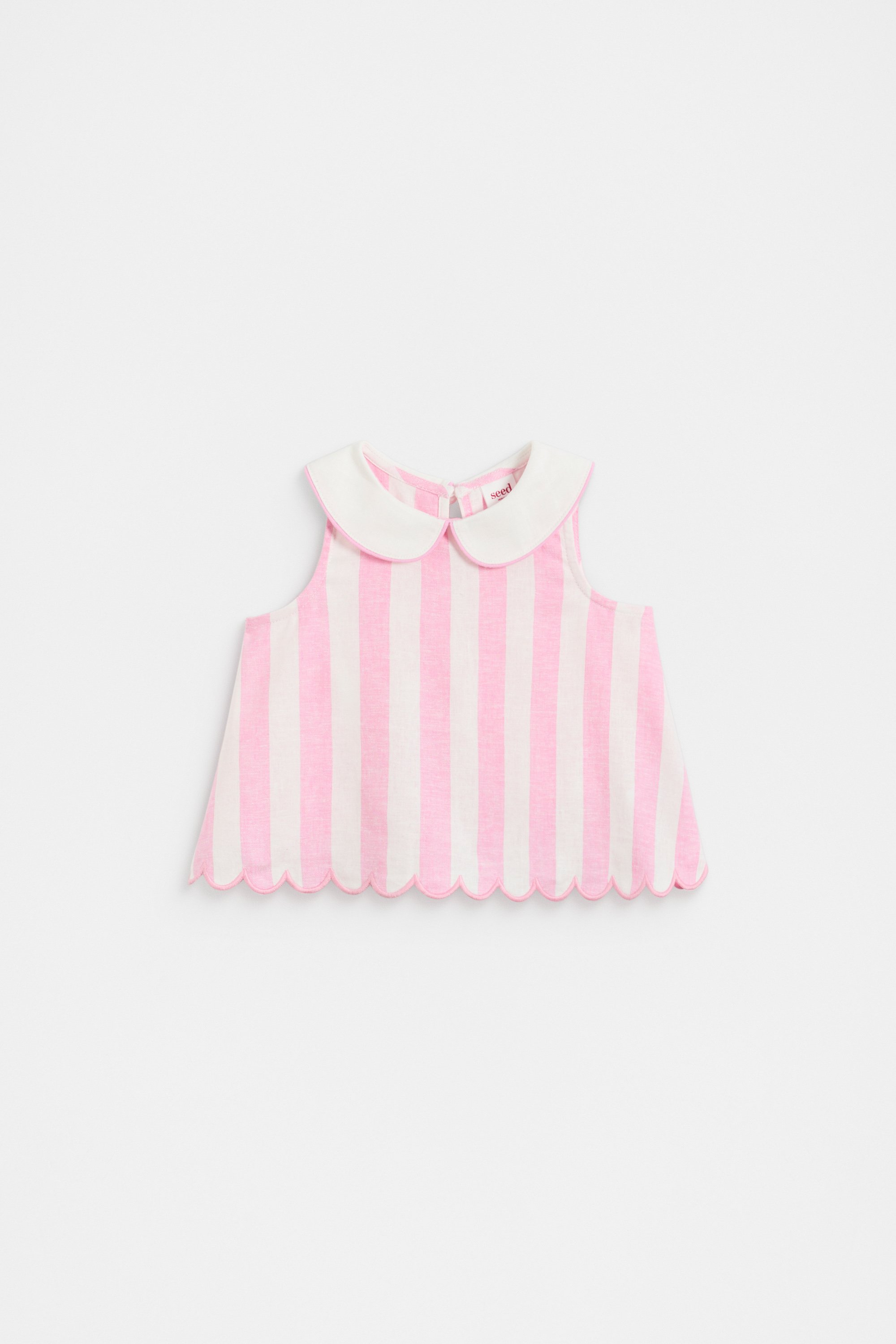 Brighten her look with this sugary sweet top, finished in a candy stripe. Crafted in a lightweight blend containing linen, it's a sleeveless design featuring the cutest little Peter Pan collar and secures with a button at the back of the neck. Pair with the matching bloomers for an adorable head-to-toe set.