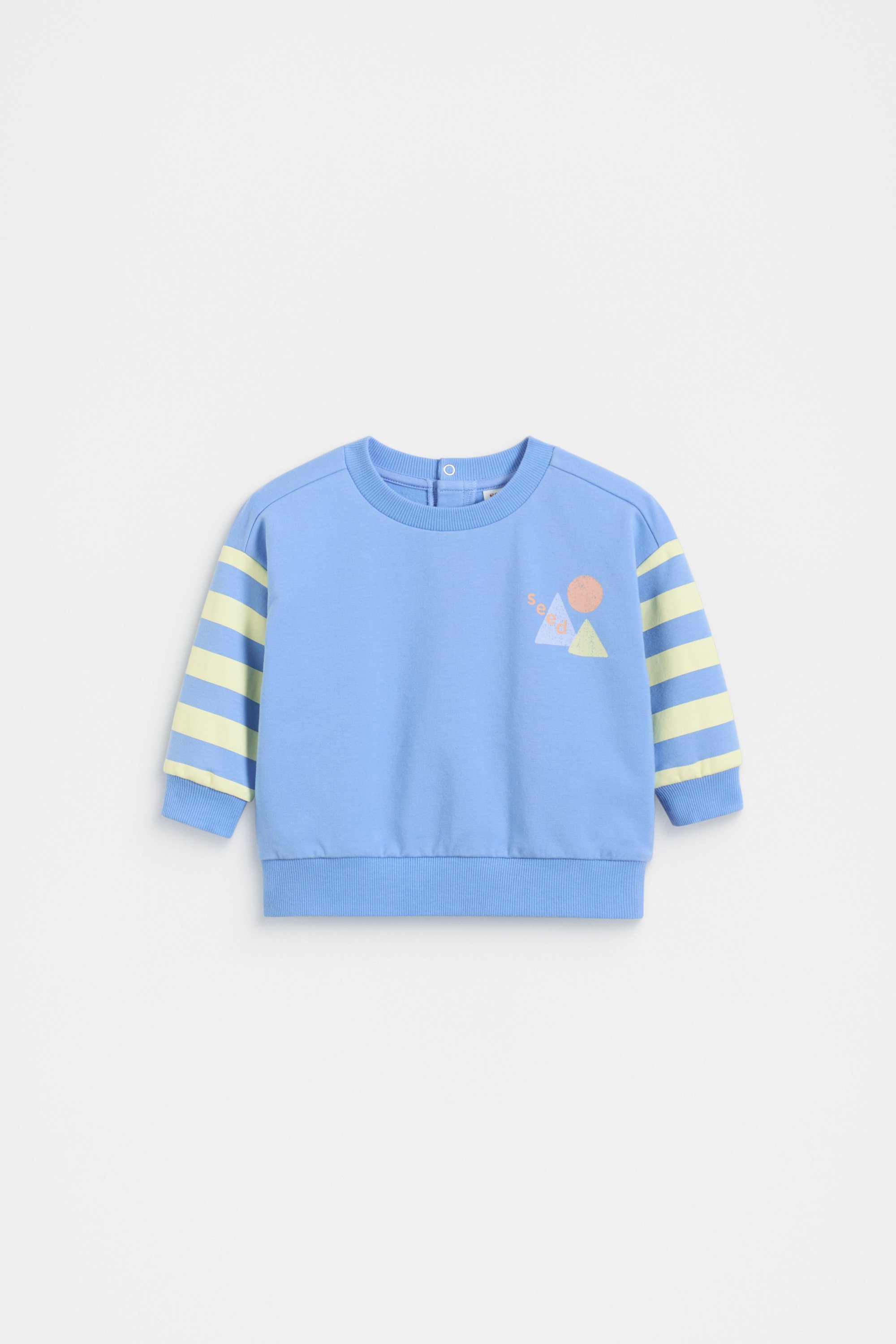 A cosy option for the in-between seasons, this little sweater is the cutest option for his little wardrobe. Crafted in a premium stretch cotton blend, it features a round neck, long sleeves with a stripe design and a retro shapes graphic. For ease and wearability, it has buttons up the back.