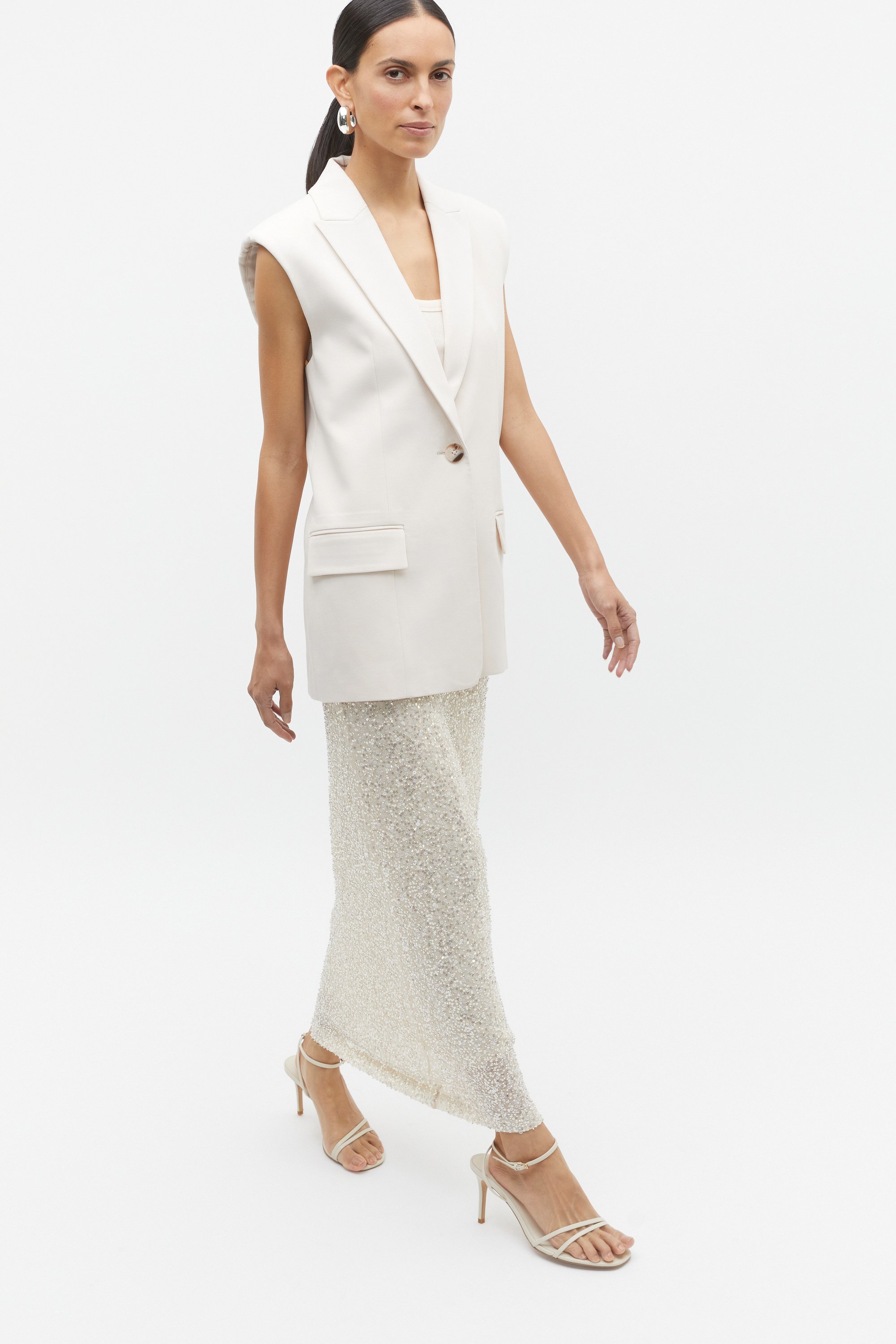 Create a bold silhouette with this vest, featuring a modern boxy fit. It has a notched lapel, statement padded shoulders, a welt pocket at the chest, and duo front pockets. It's lined, with a single button closure and a longline shape. Wear it with the matching column skirt or shorts for a coordinated look.