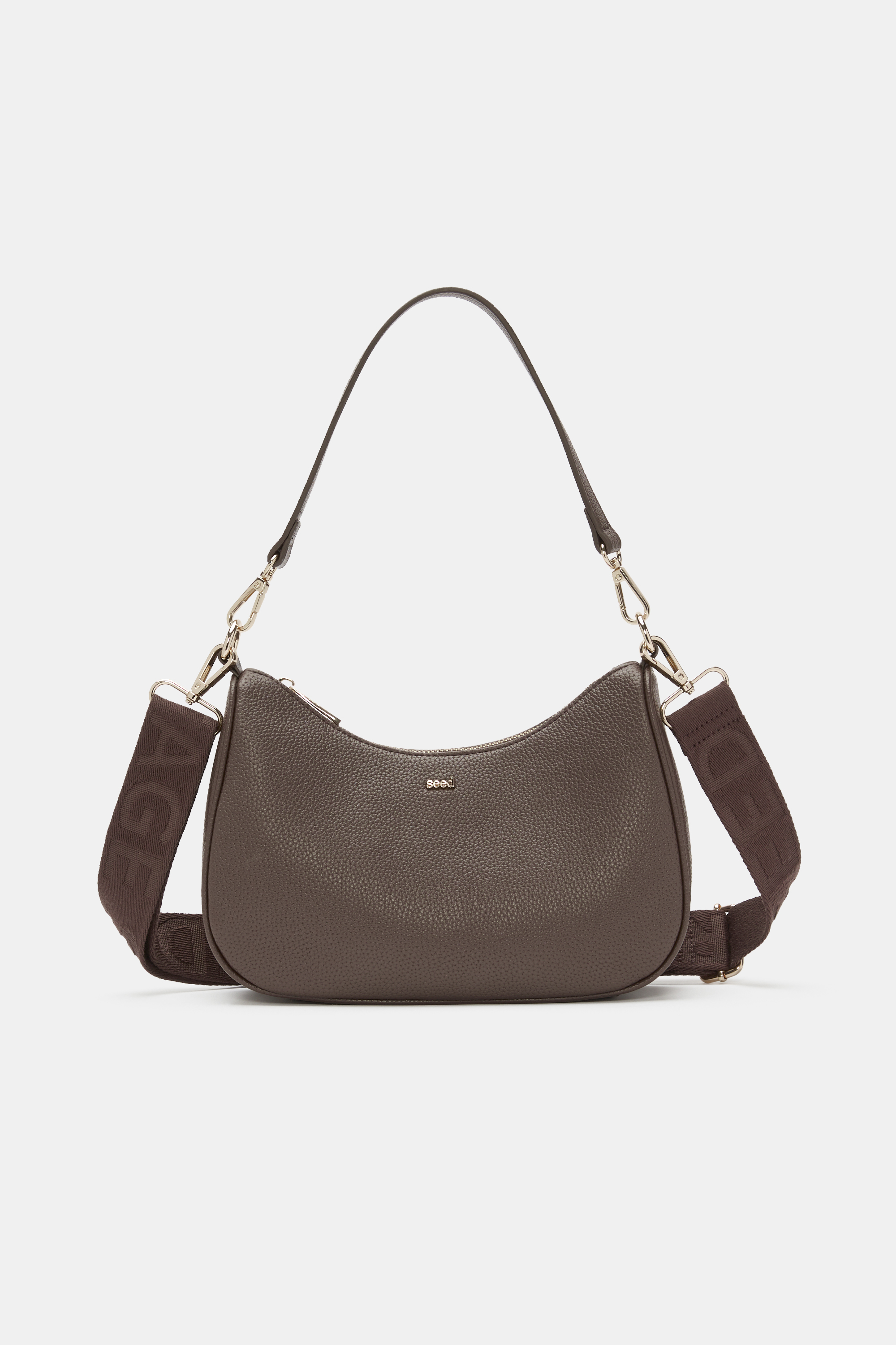 Chic and essential, this style is a contemporary design finished in a warm chocolate brown. It features two detachable straps attached with soft gold hardware, a curve design and a metal Seed logo.