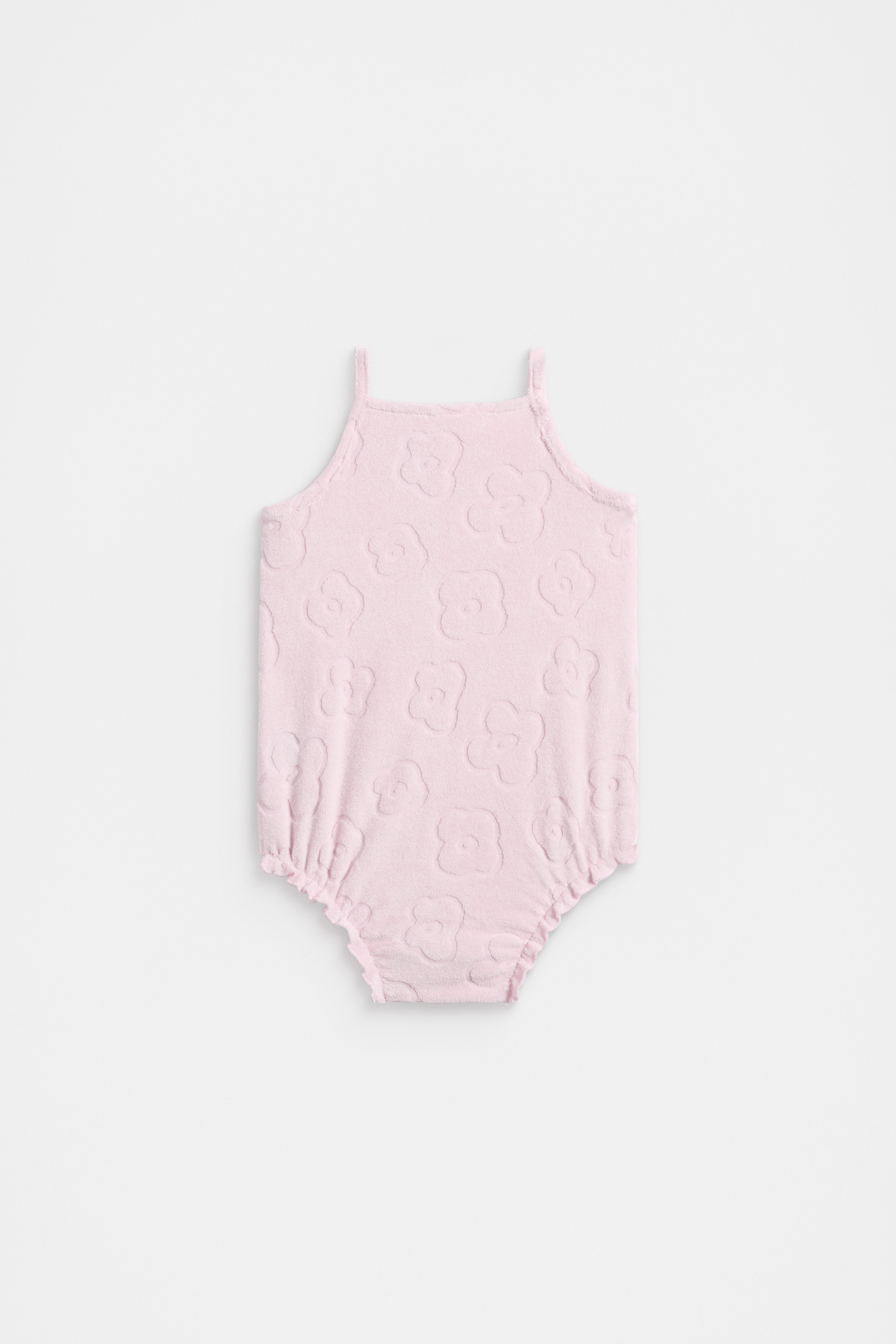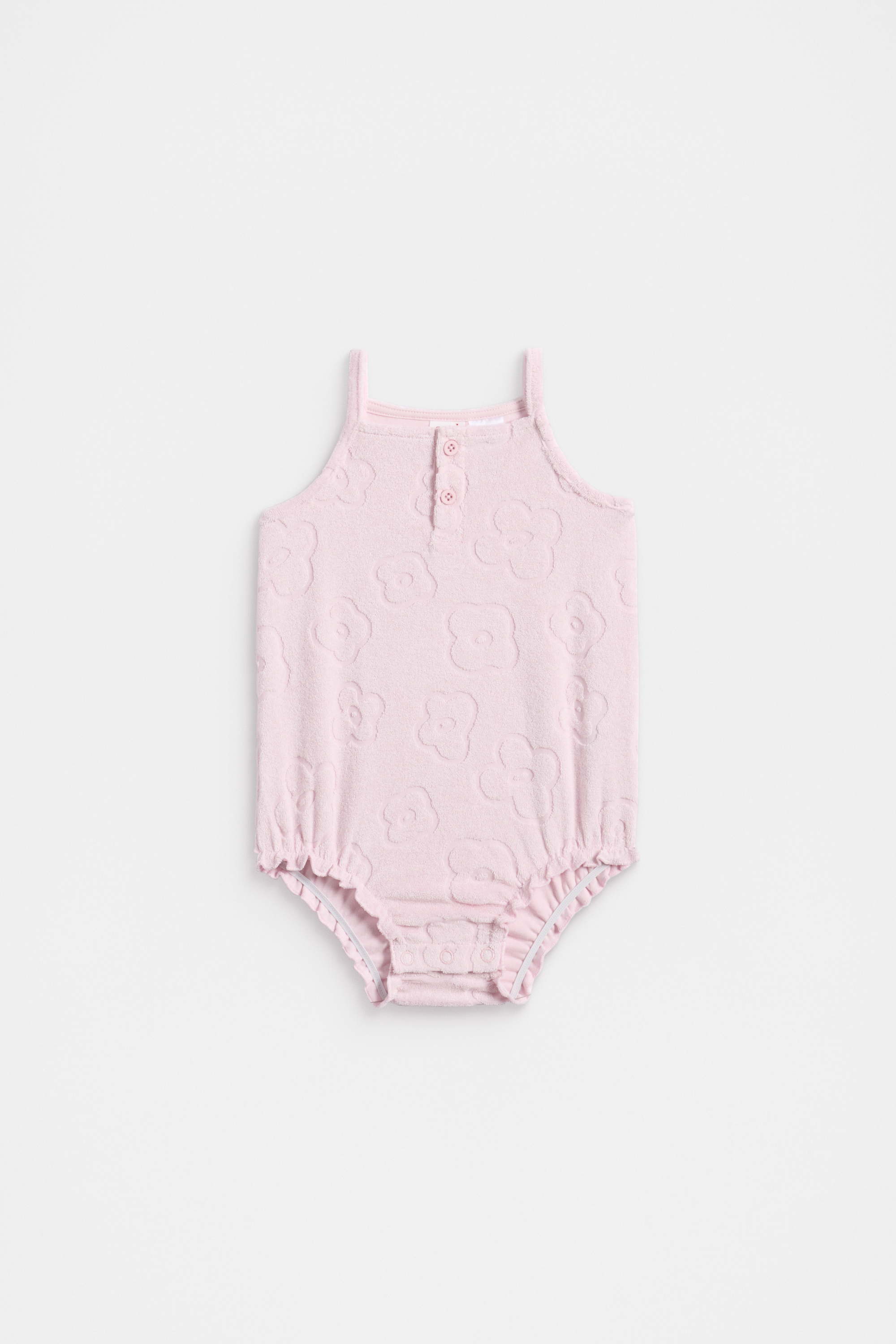 A sweet little option for their wardrobe, this romper has the cutest details. Crafted in a terry towelling cotton blend with an all-over textured floral print, it features a straight neckline, thin straps, a button front detail, elasticated leg openings and gusset snaps.