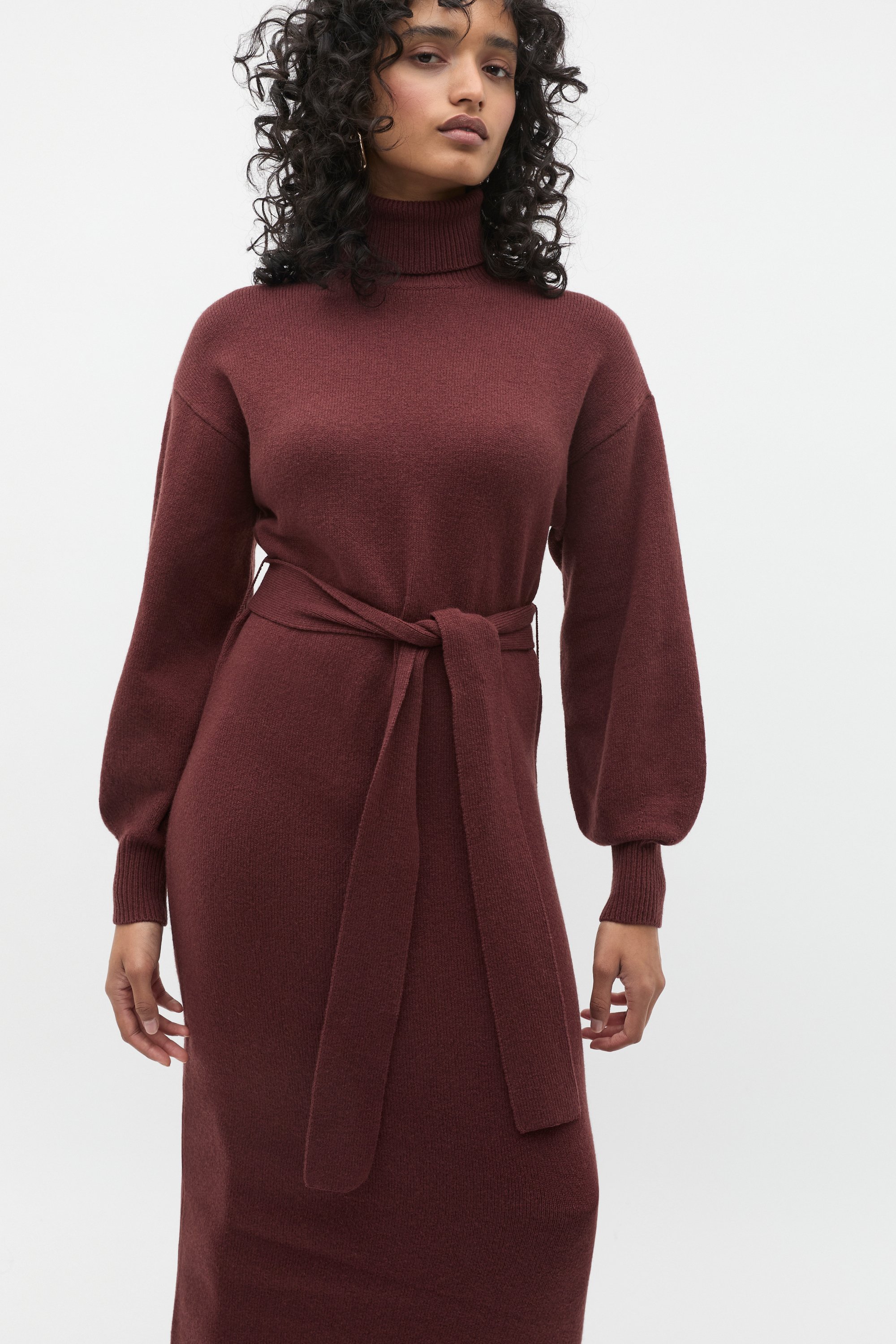Winter styling is made easy with this chic knit dress, designed to offer warmth with a touch of luxe. It features a high neck, long sleeves with a wide balloon effect and ribbed trims at the cuffs. It falls to a midi length and has a tie belt to cinch the waist and flatter your shape. Containing wool and cotton, it's a medium weight knit, perfect for staying cosy.