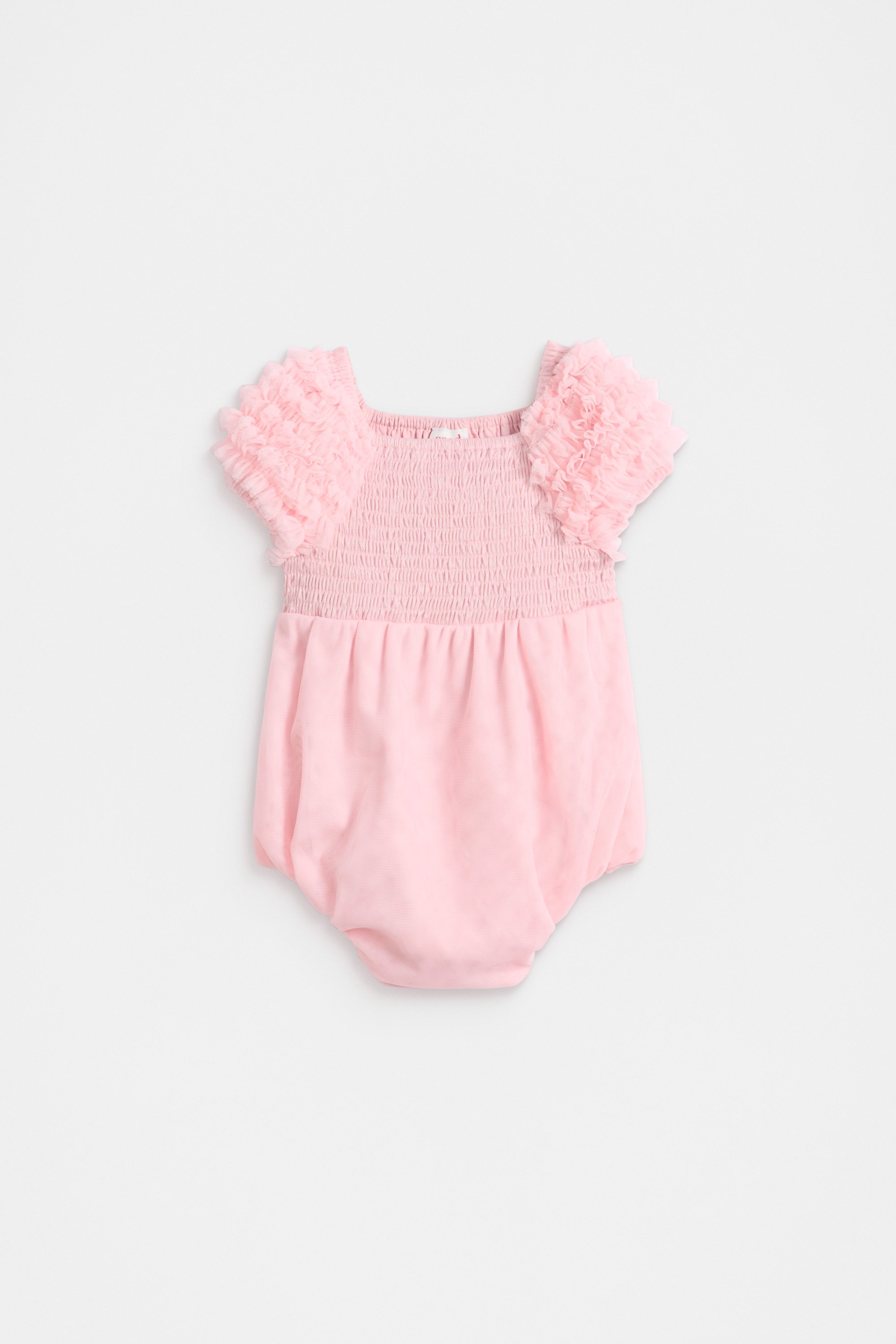 With the sweetest ruffle design, this little romper is perfect for special occasions and family events. Finished in tulle, it features a shirred front, ruffle sleeves with elasticated trims, and a bubble shape. It has plenty of stretch, gusset snaps and elasticated leg openings for a comfortable fit.