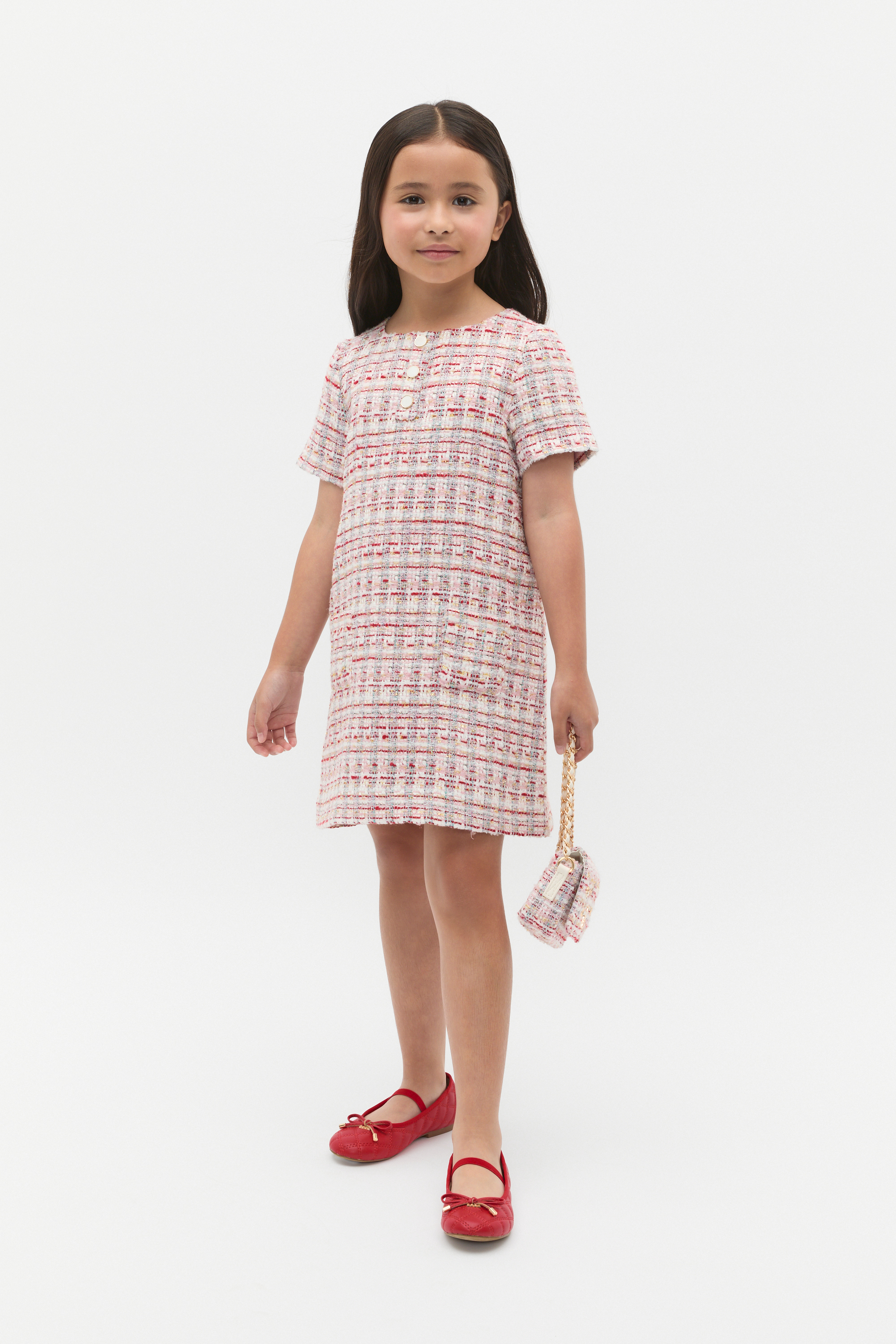 She'll be party-ready and more chic than ever in this tweed dress, designed for her special occasions and family events. It features a round neck with a button detail, short sleeves and two front pockets. It secures with an invisible zip at the back of the neck. Pair with the coordinating accessories or jacket for the sweetest matching set or for the perfect gift.