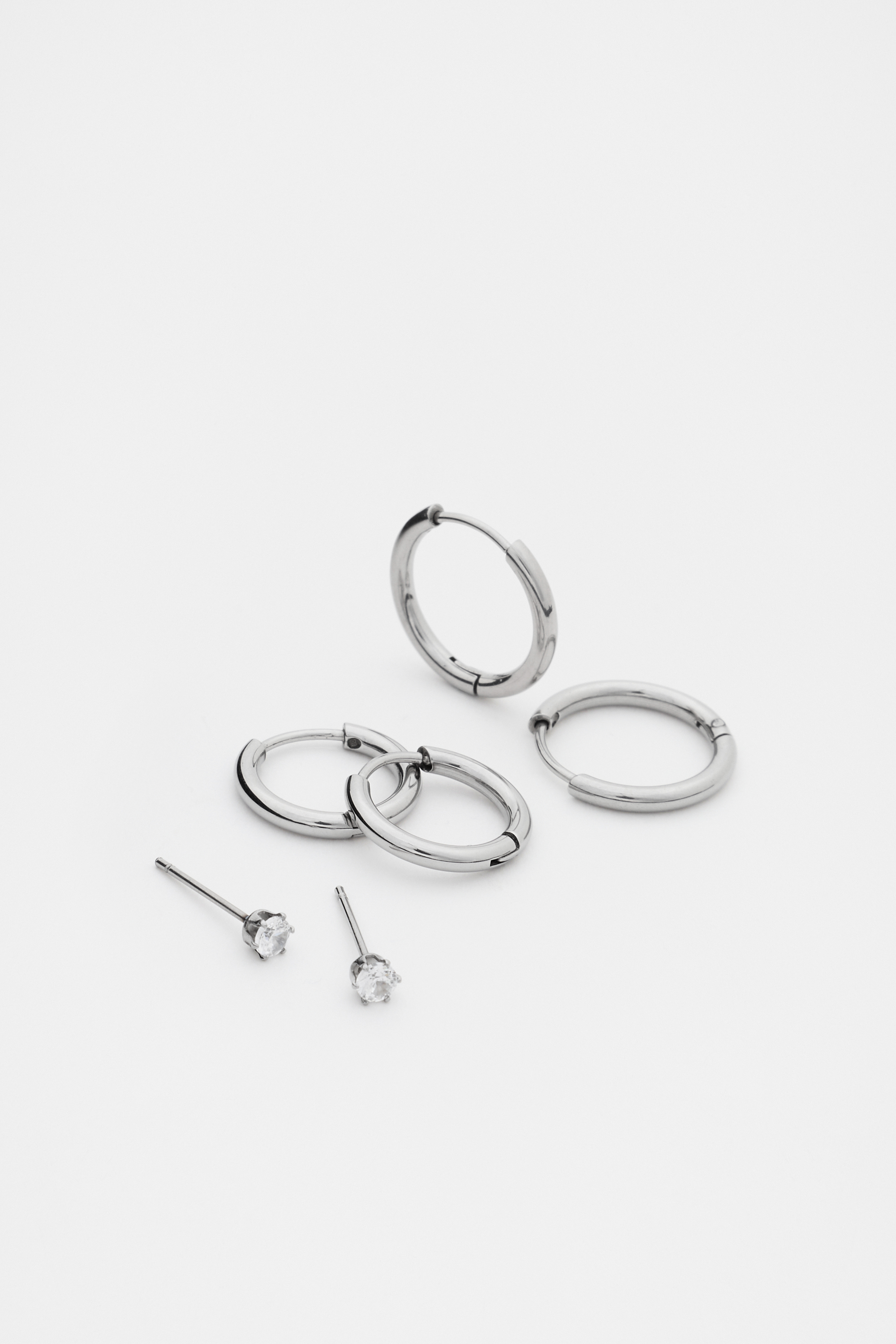 Elegant and understated, this earring set is ready for your everyday styling. Perfect to be worn together, the set features a simple stud design as well as two sets of small hoops. Discover pieces made to last with our collection of Physical Vapour Deposition (PVD) plated jewellery. Stainless steel pieces coated with PVD plating are safe to wear in water and offer enhanced protection against scratching, fading or tarnish for a smooth and lasting finish.