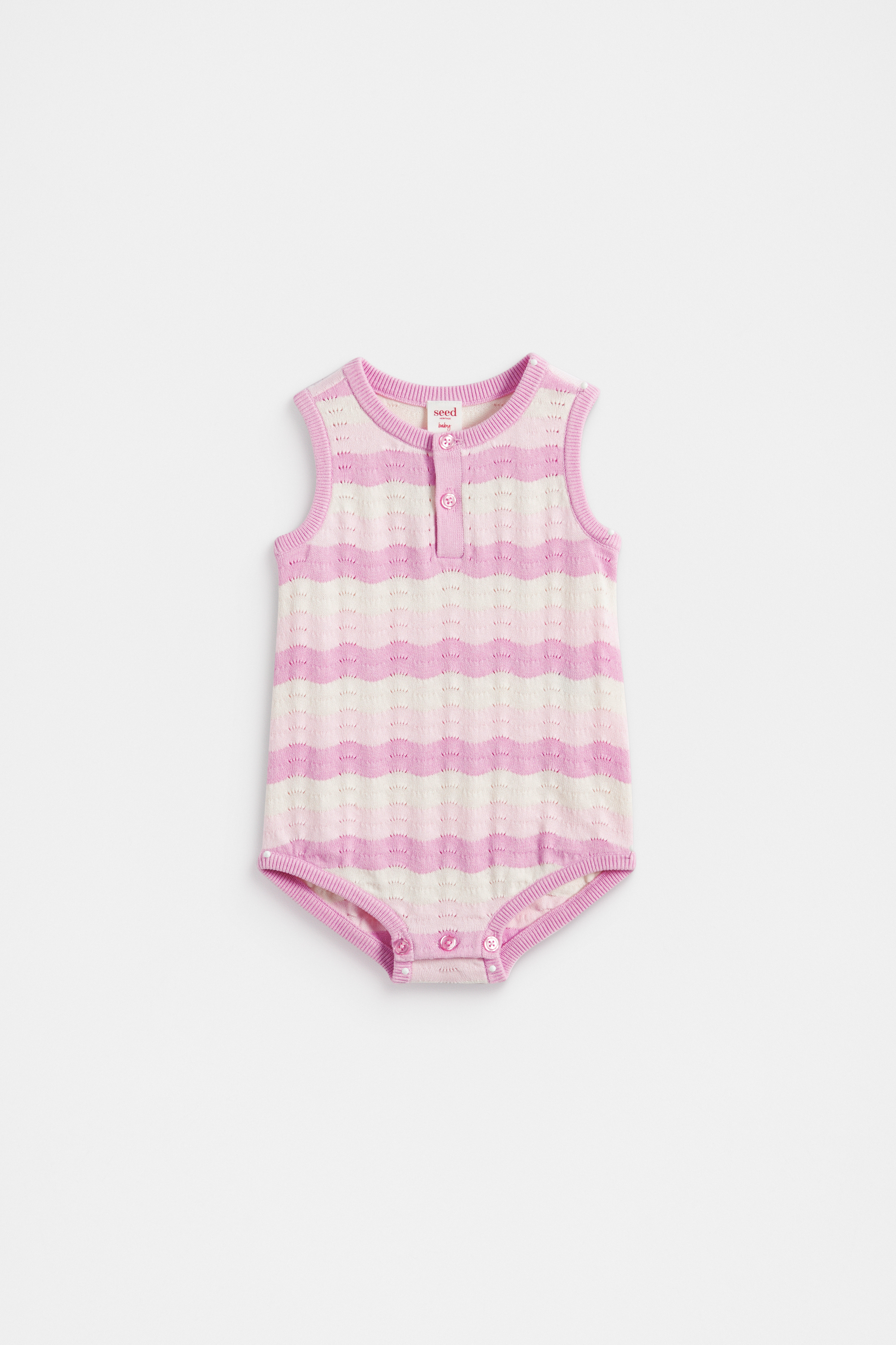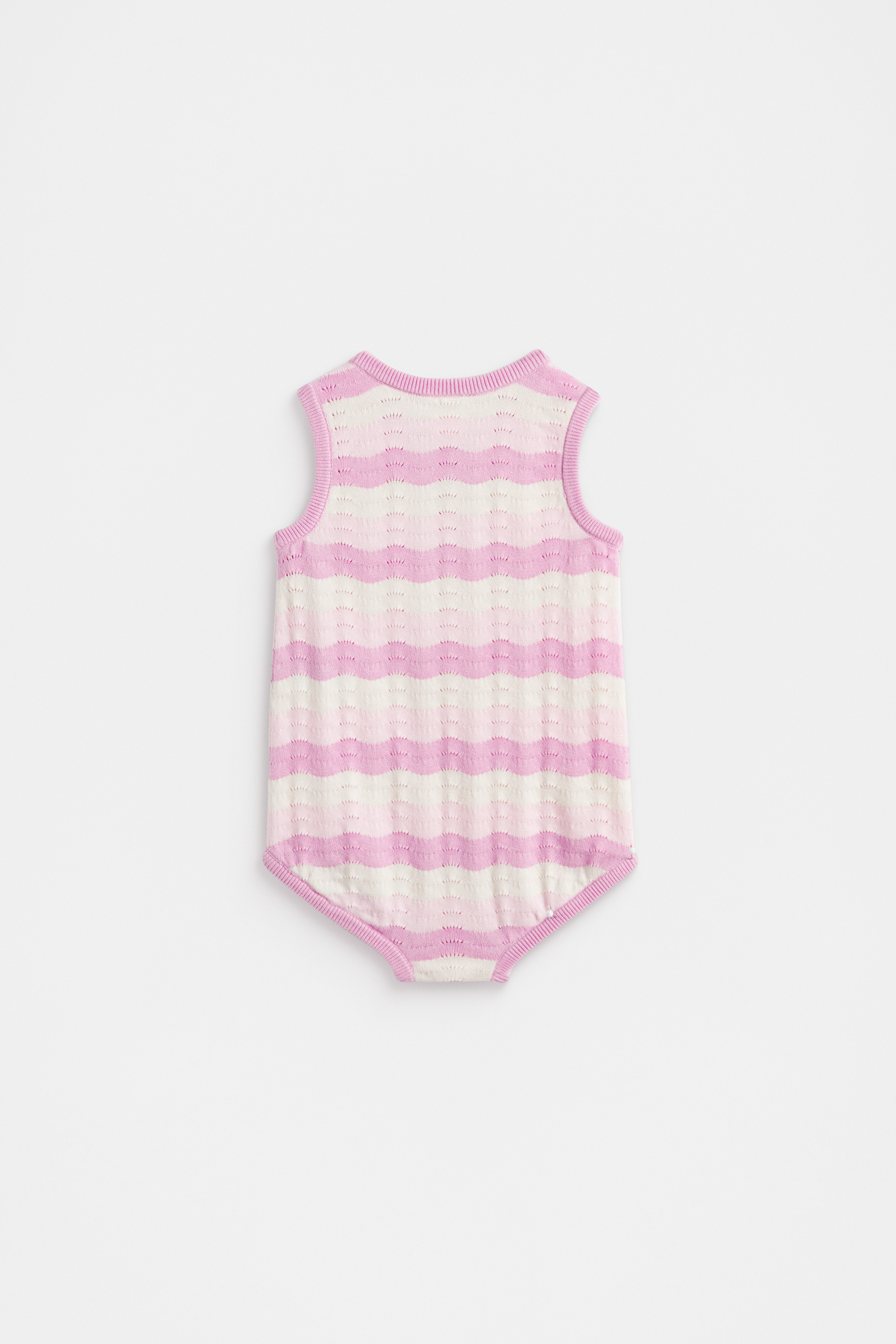 A sweet tonal option, this romper is perfect for the warmer months. In a textured knit with a wavy pattern, it has a round neck, sleeveless construction, and ribbed trims. It secures with a short button placket and buttons at the gusset, and is crafted from cotton.