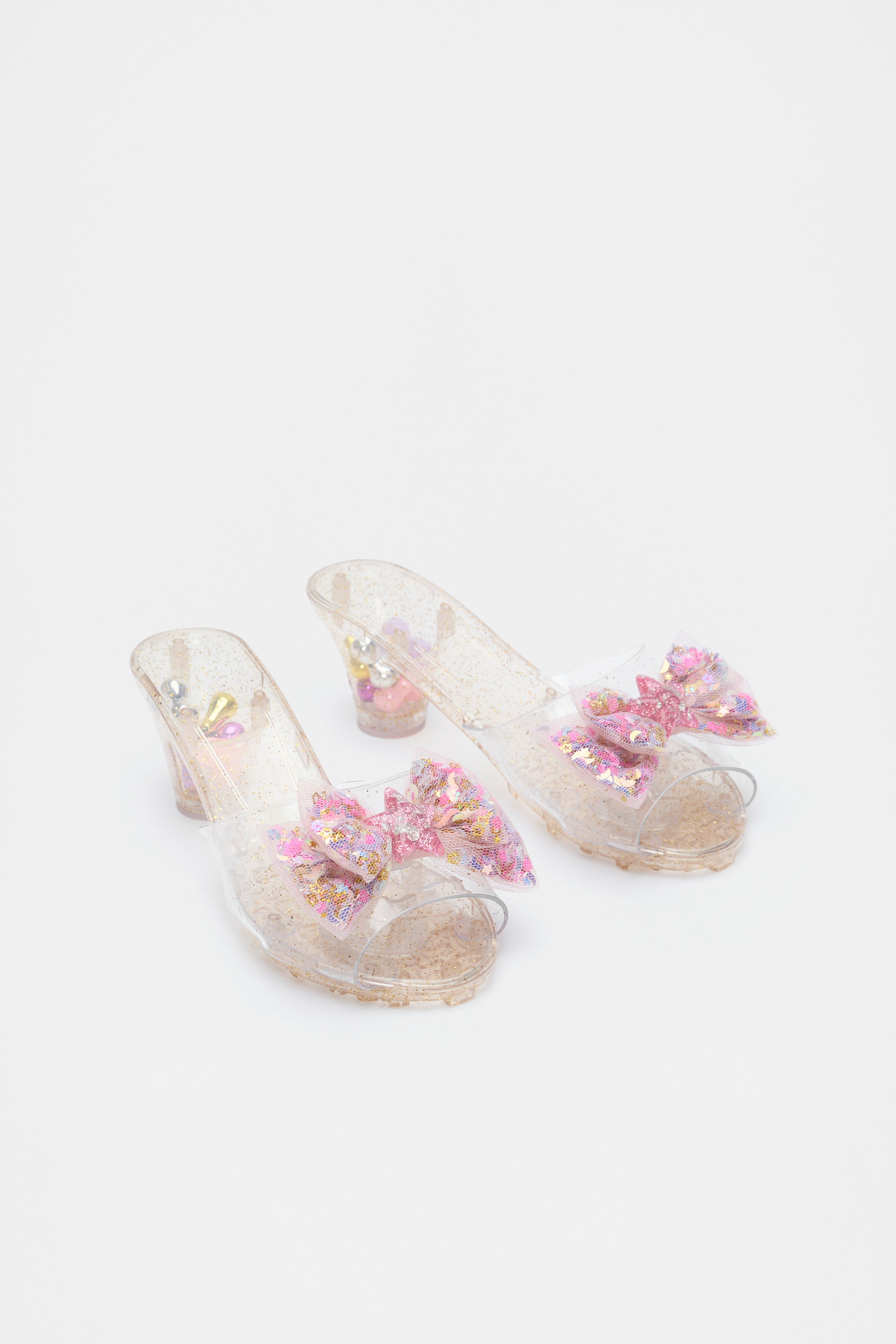 Sparkly and sweet, these dress up shoes are perfect for the costume box. They feature a small bead-filled heel and glittery bows on top. Pair with the whimsical witch set and cape. Not recommended for children three years and under, potential choking hazard.