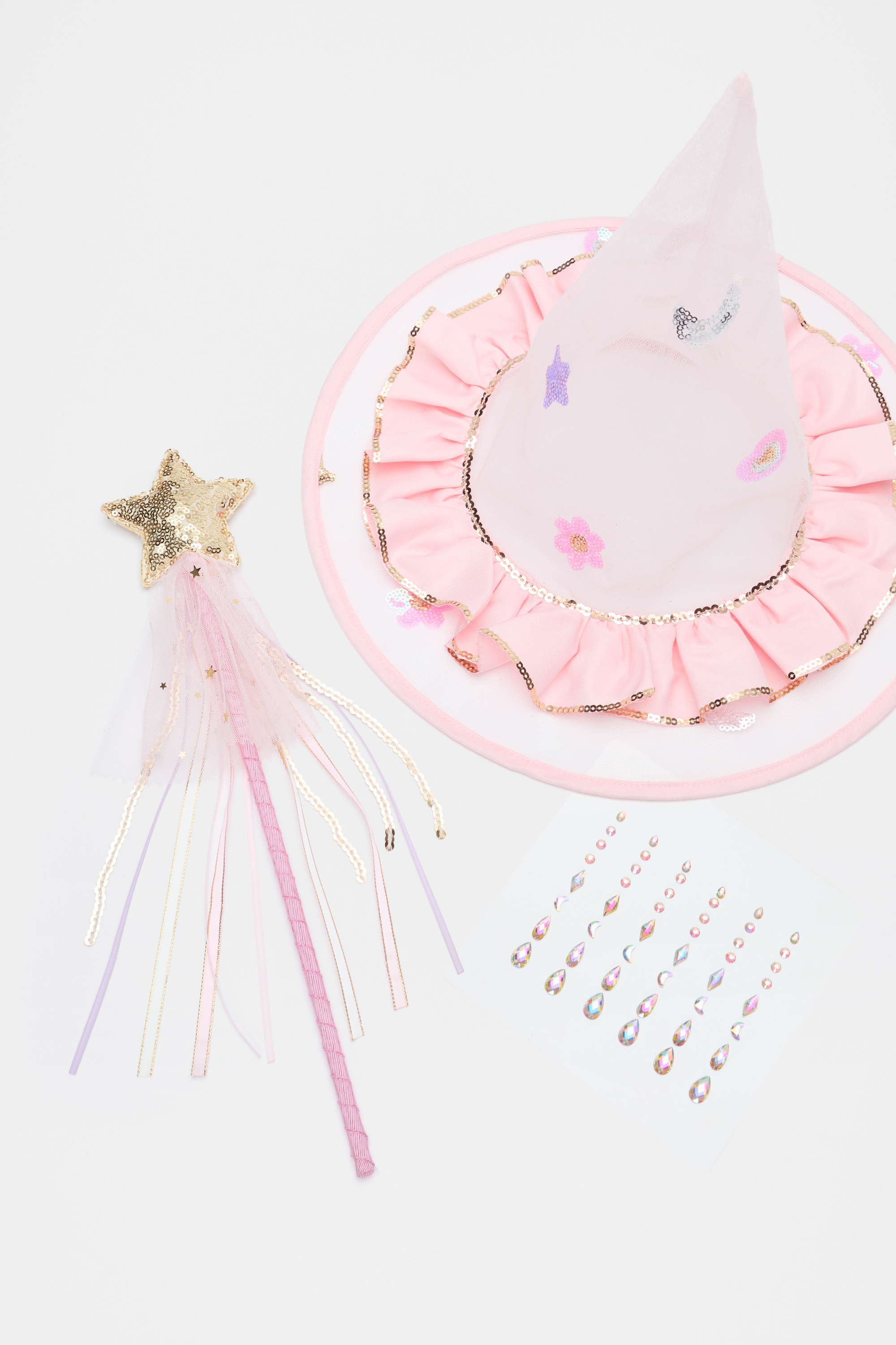 Cast a magic spell with this whimsical witch set, perfect for play time. This set includes a mesh pink witch's hat with sequin details, a wand with a sparkling star, and face gems. Pair it with the matching whimsical witch cape. Not recommended for children three years and under.