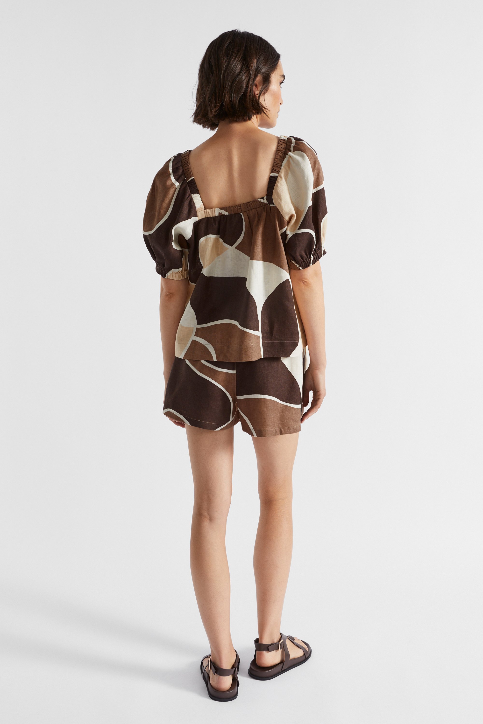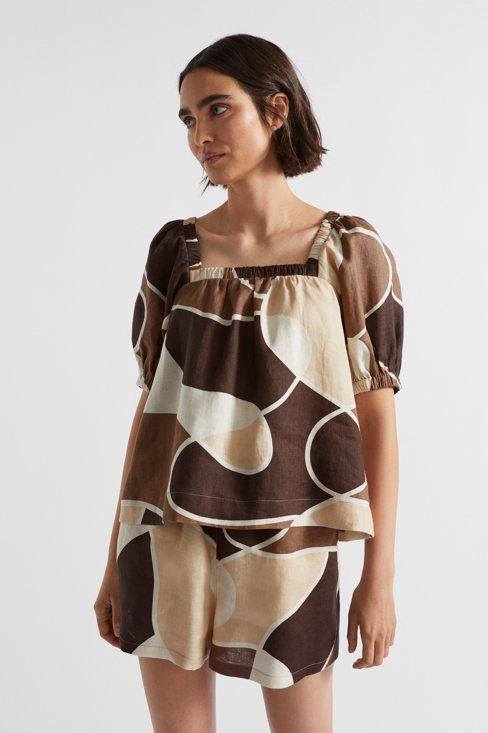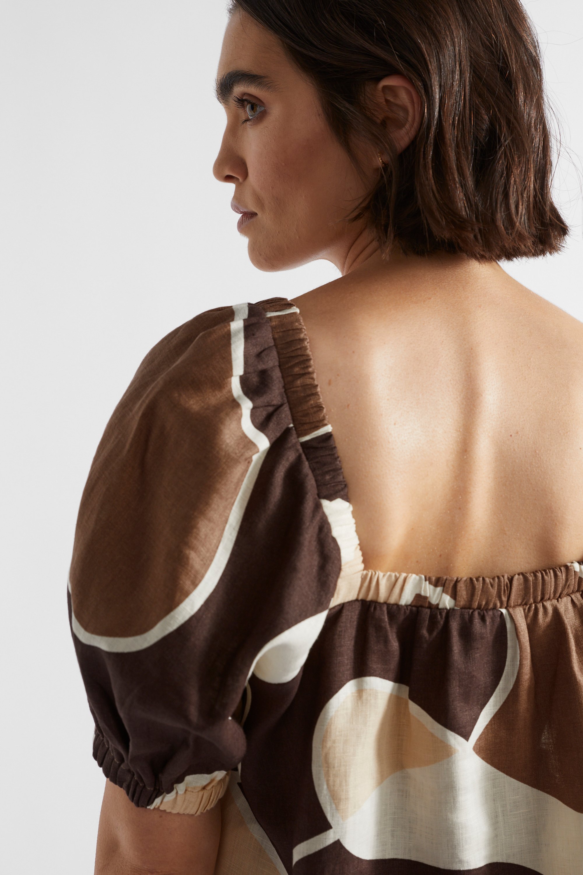 With a gathered square neckline and statement sleeves, this top is an ideal option for warm, casual days. It is crafted from premium French linen and features our signature abstract print. Pair with the matching skirt for a complete look.