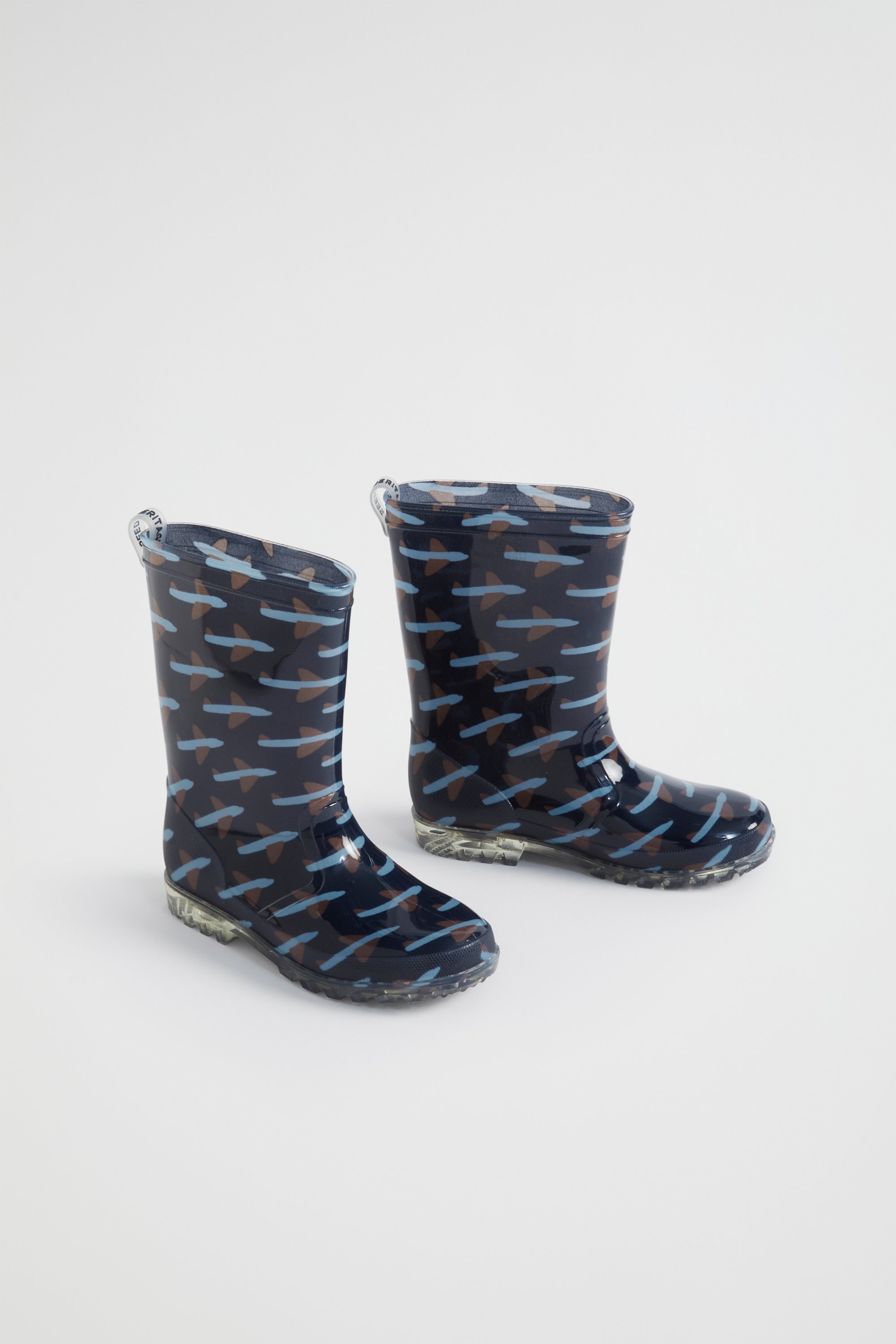 Add a fun touch to a rainy day with these gumboots. In a shiny finish, they feature a light-up grip sole, a logo-branded pull tab and an aeroplane pattern. Wear them with the matching umbrella, rain hat and rain coat for a complete look.