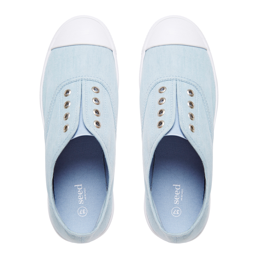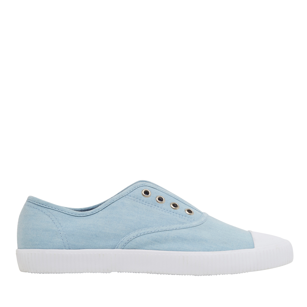 Relaxed pull on sneaker with eyelet detail. Fabric upper/Rubber sole.