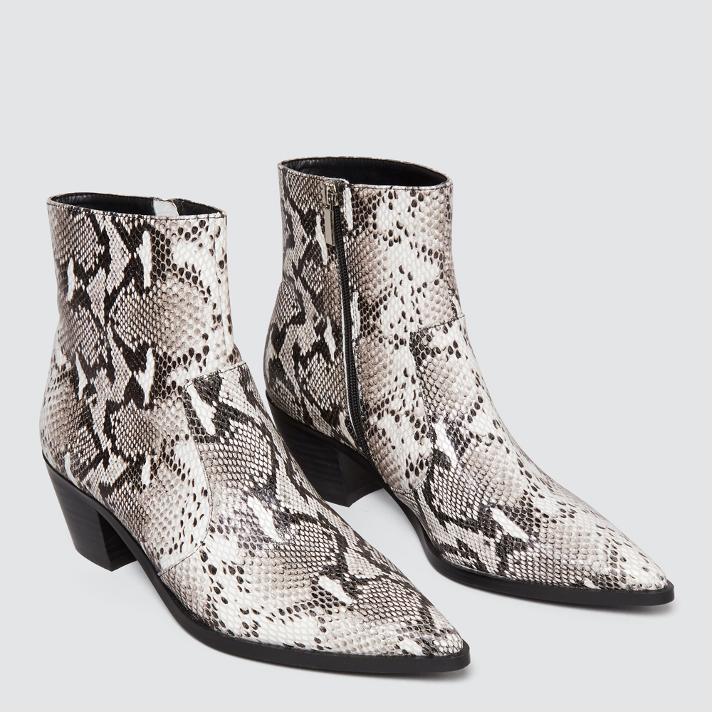 An update to your classic boot this style is perfect for everyday wear and features a block heel, internal zip and front stitching detailing. Made with a leather upper and a manmade sole, these boots are available in Tan, Black and Snake and in sizes 36 to 41.