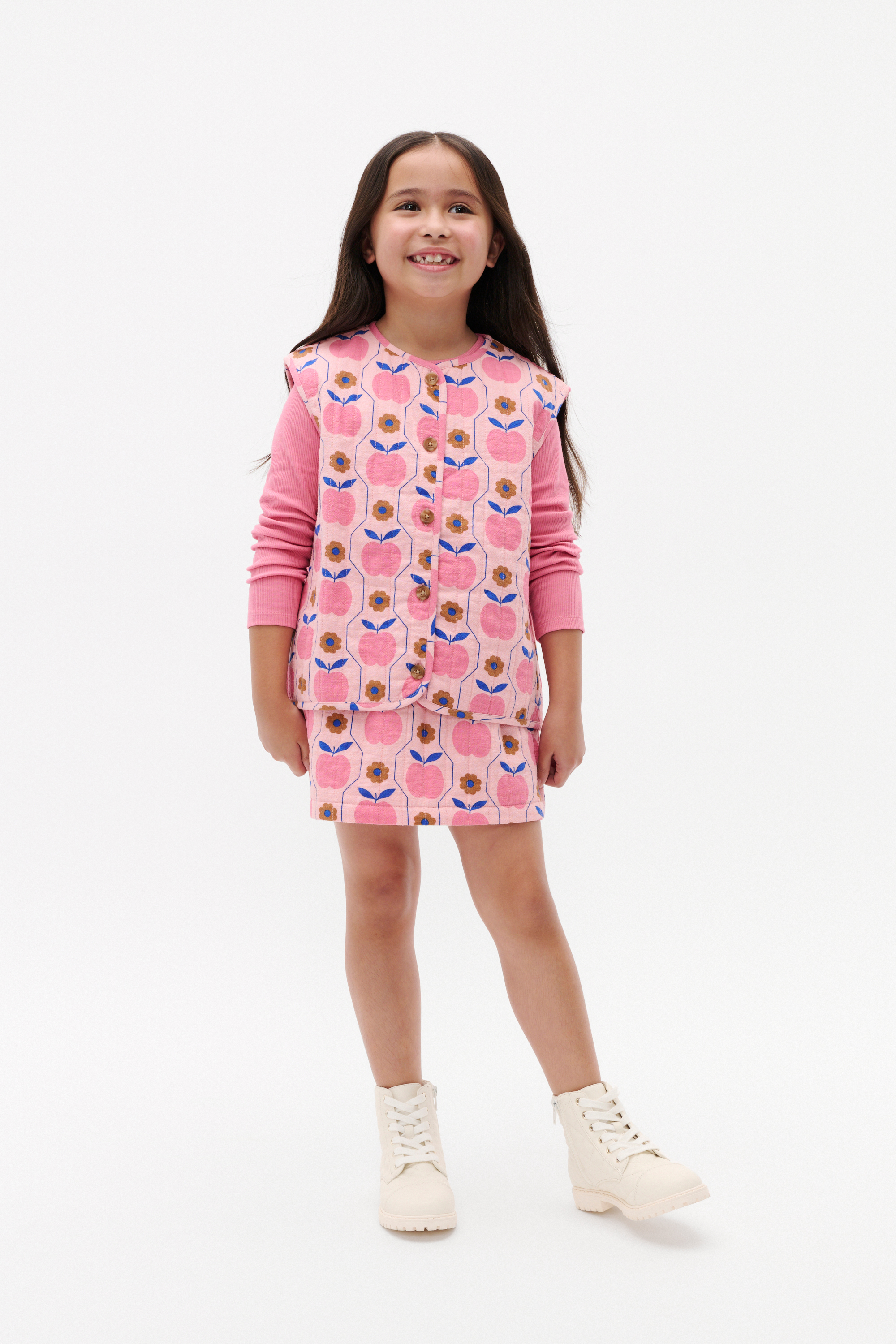 Brighten her day-to-day with this adorable apple skirt, complete with a quilted finish. Crafted in a soft premium cotton, it features an elasticated waistband for comfortable wear. Style with the coordinating quilted apple vest for the sweetest head-to-toe look.