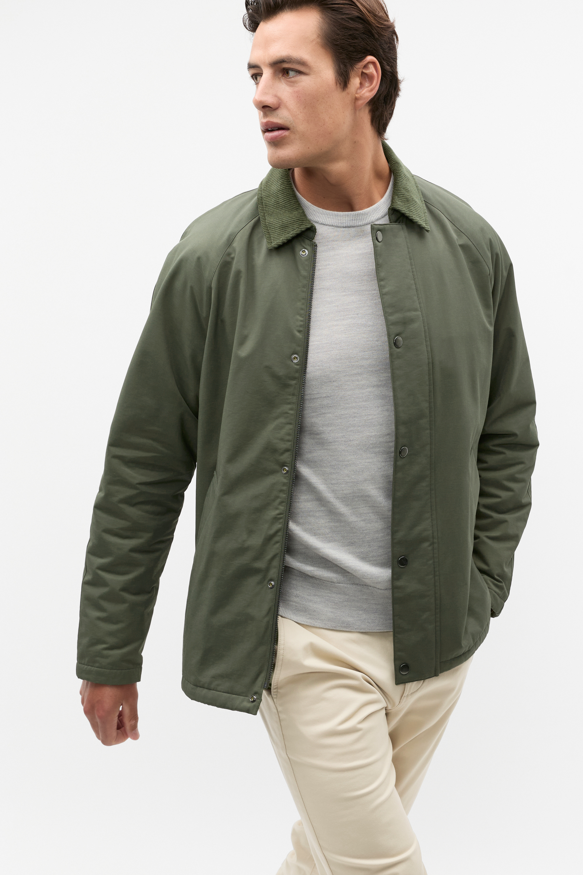 Transeasonal styling is made easy with this effortless barn jacket, a functional option for the cool change. Crafted in a premium cotton blend, it features a contrast cord collar, a zip front with a button-through panel and angled pockets.