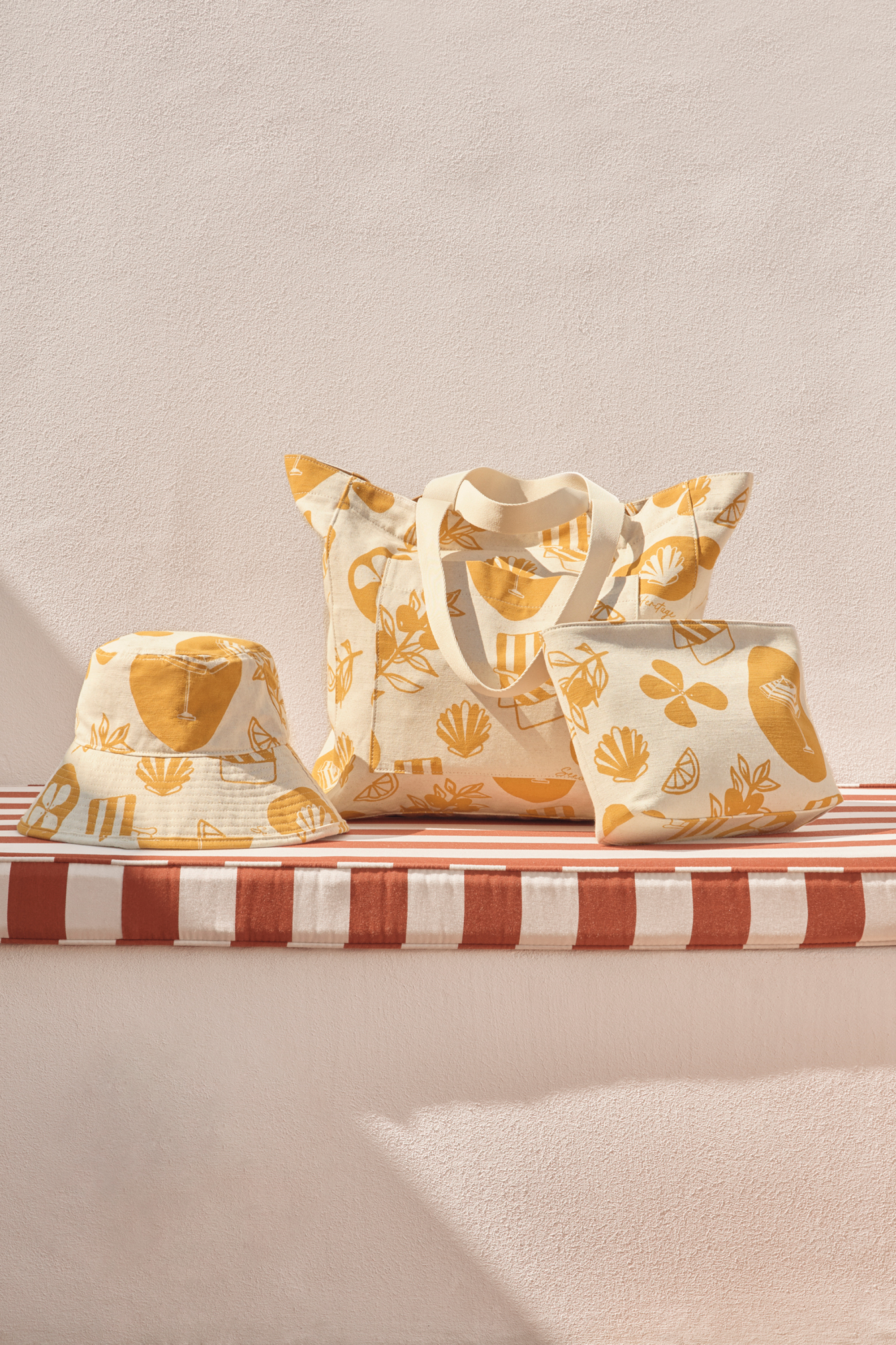 Top off your beach day outfit with this bucket hat. Pair with the matching tote or pouch for a coordinated look or for the perfect gift.
