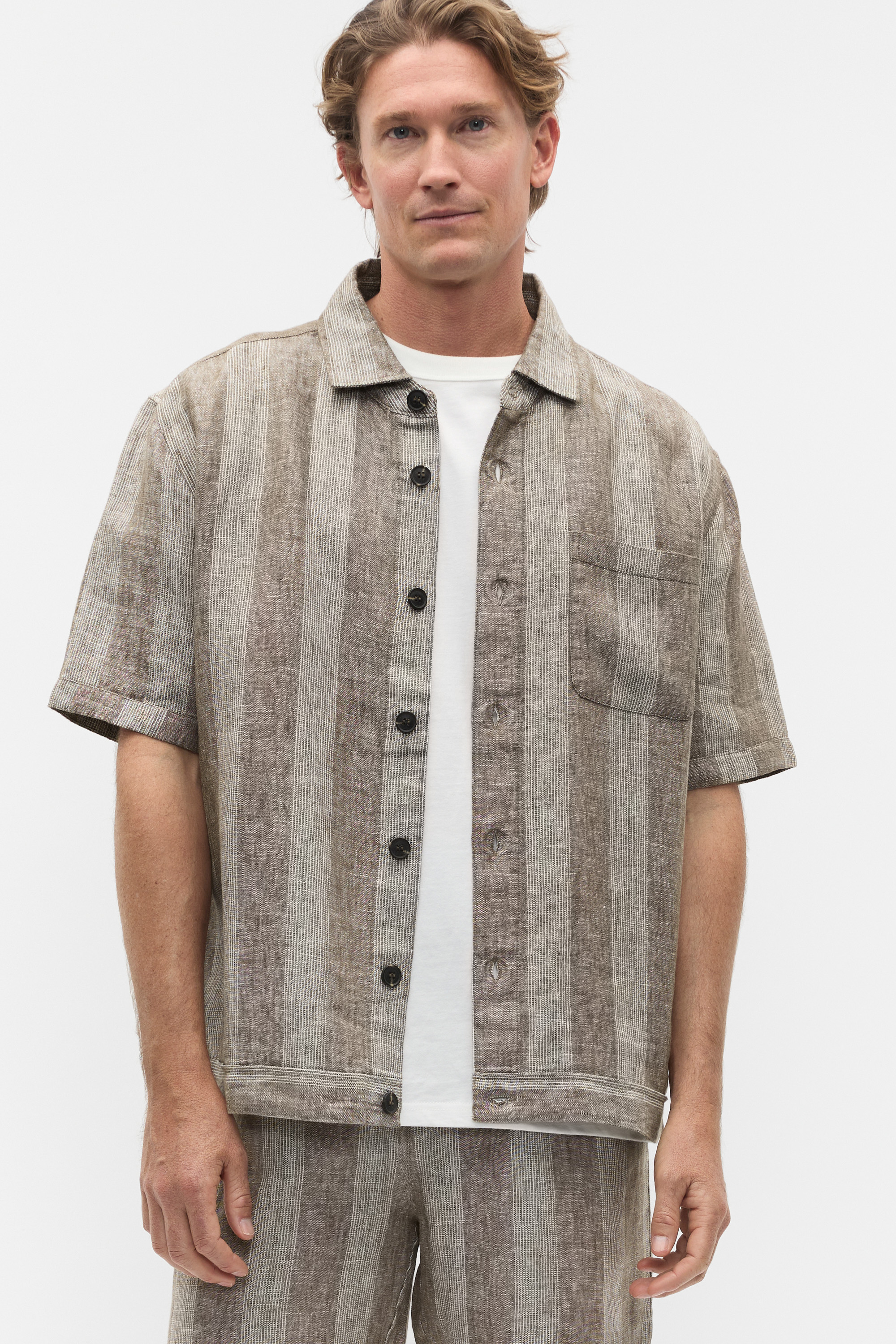 Elevated in its simplicity, this shirt is a boxy style, ready to be worn all through the warmer months. Crafted in premium linen, it features a collar, short sleeves, a breast pocket and a button through front. Pair with the coordinated linen shorts for effortless head-to-toe style.