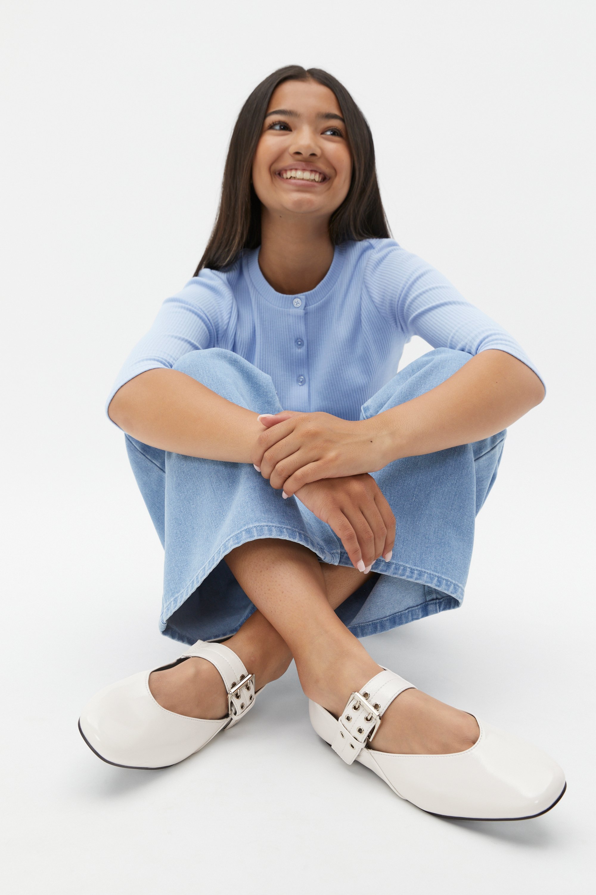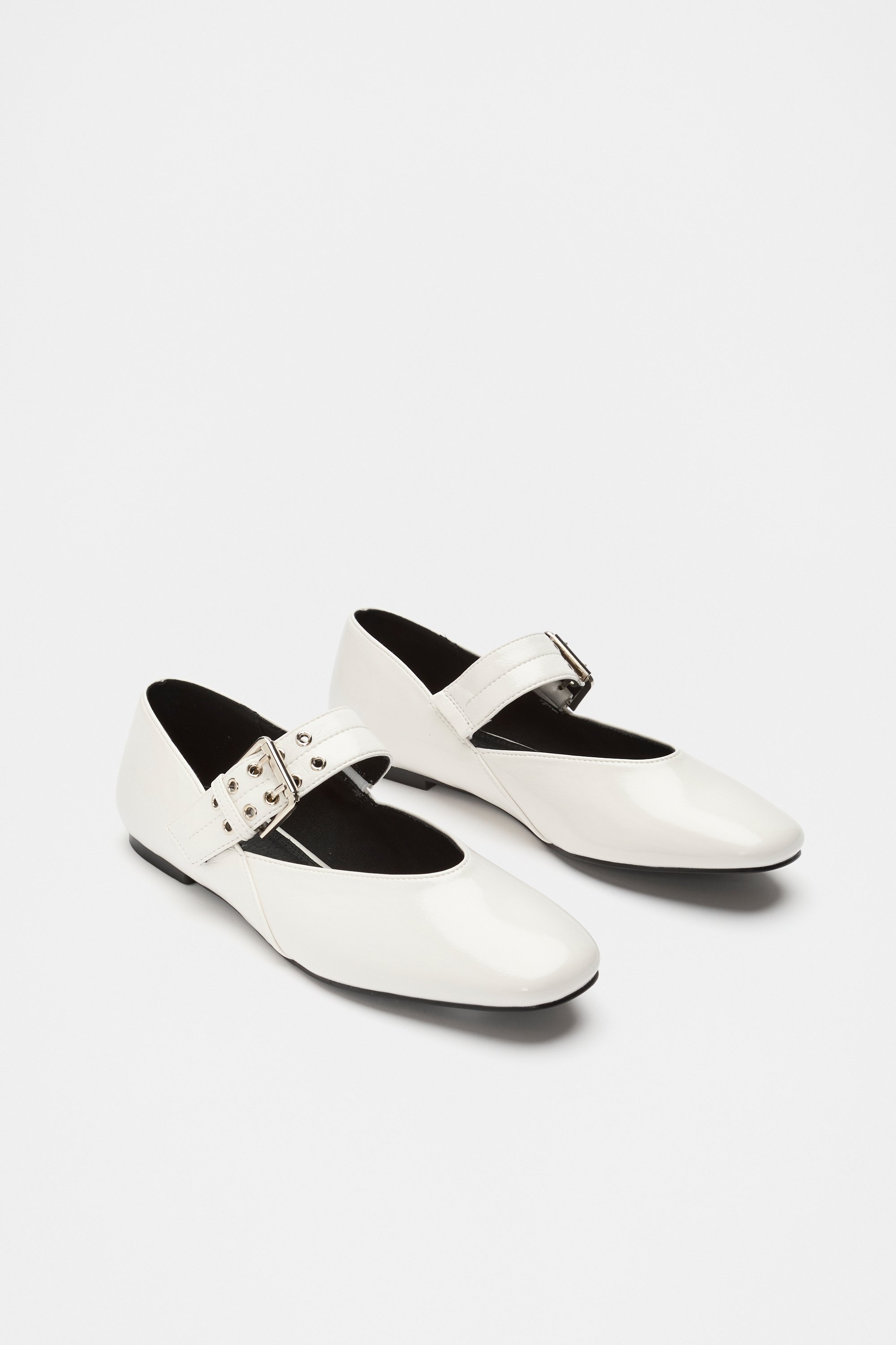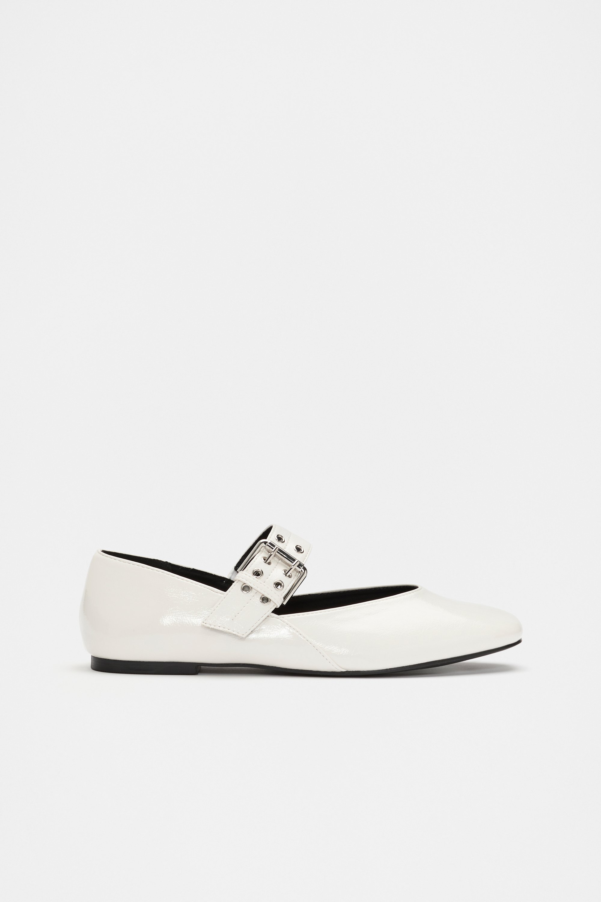 A simple, modern style, these flats are perfect to update her look. They feature a strap with buckle and eyelet details and have a patent finish. Pair with the matching patent bag for a curated look.