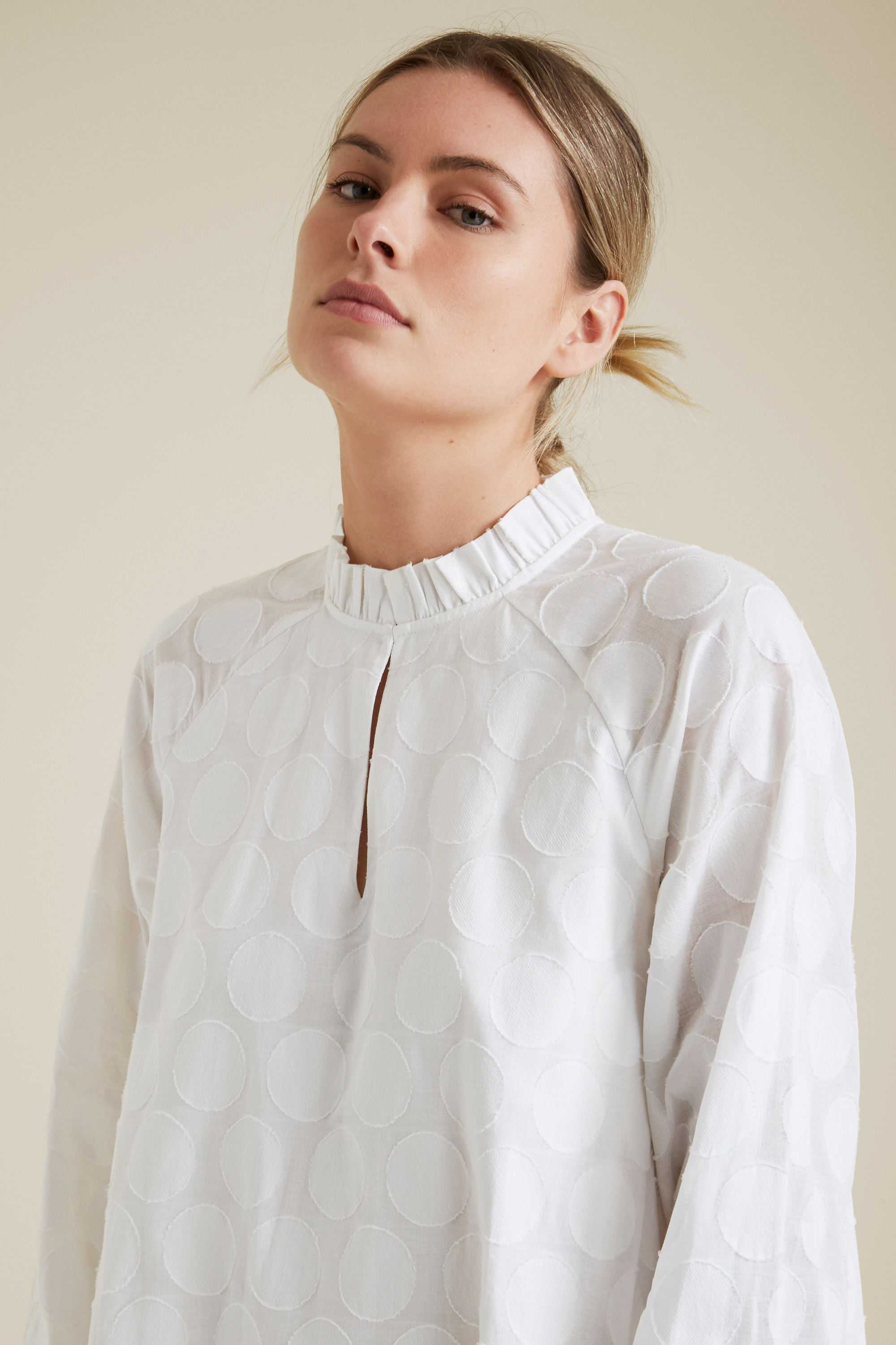 • Pleated frill collar with hook and eye fastening that can be worn closed as a high neck or open as a relaxed V neck,