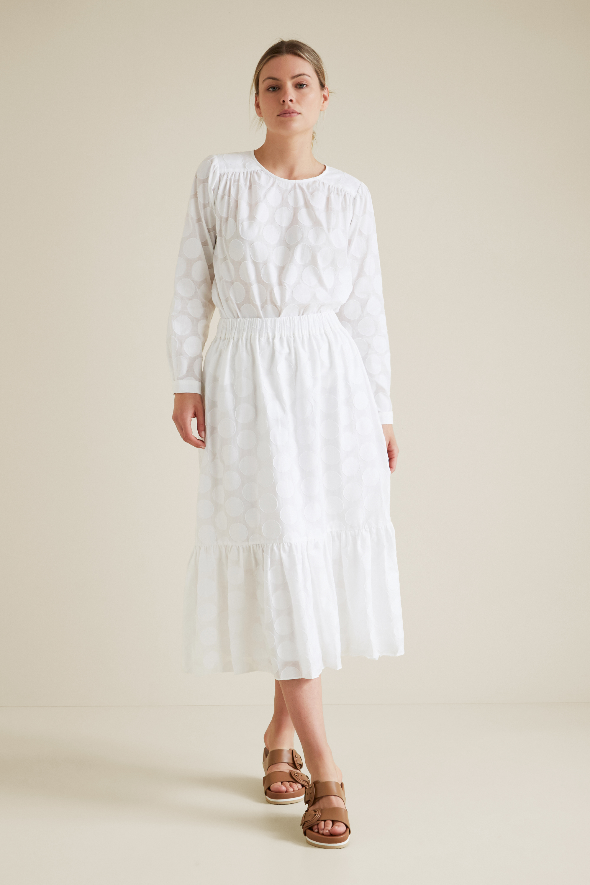 Designed in a beautiful all-over spot design, this Burnout Skirt sits high on the waist, featuring a flattering tiered silhouette and elasticised waistband for added comfort.