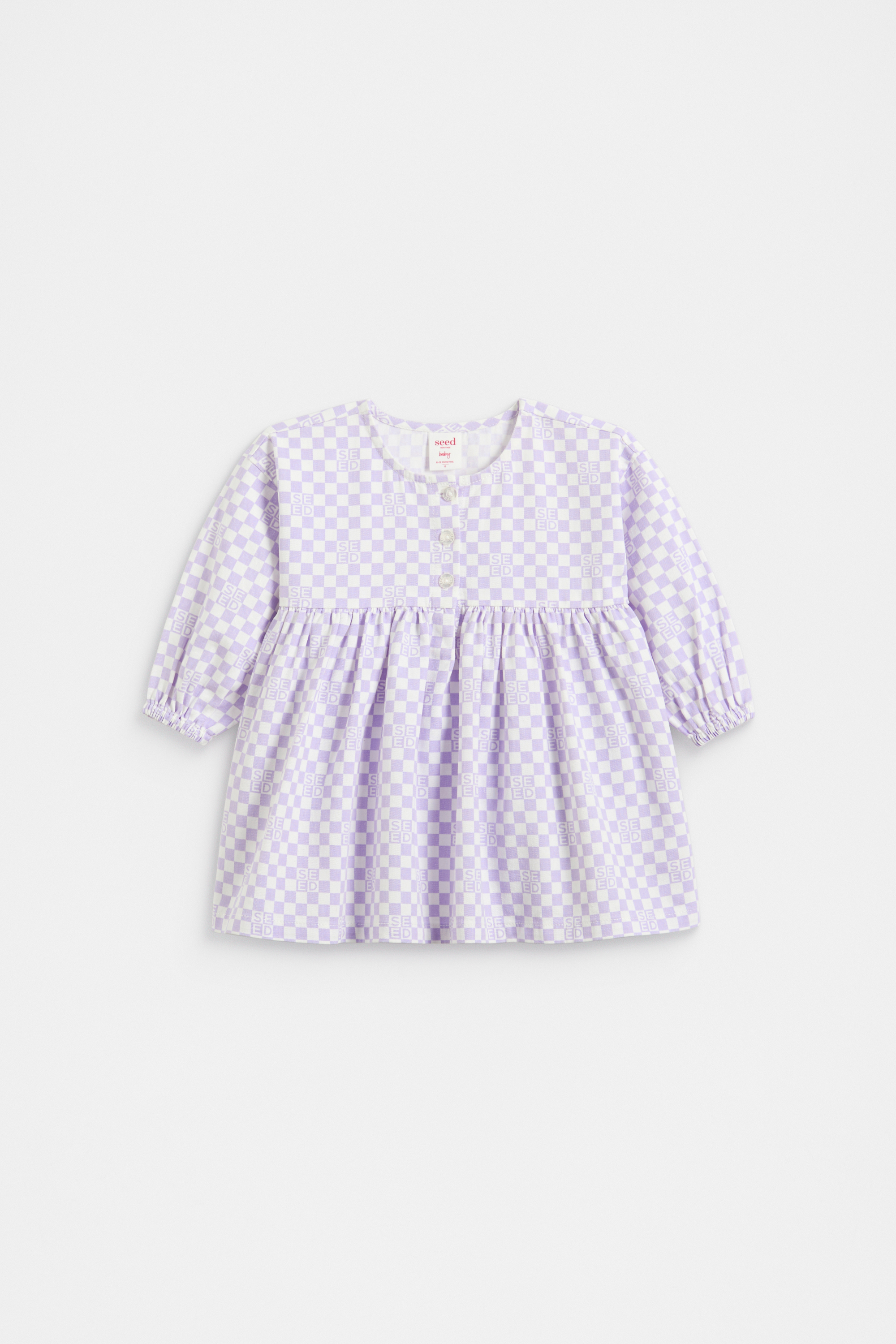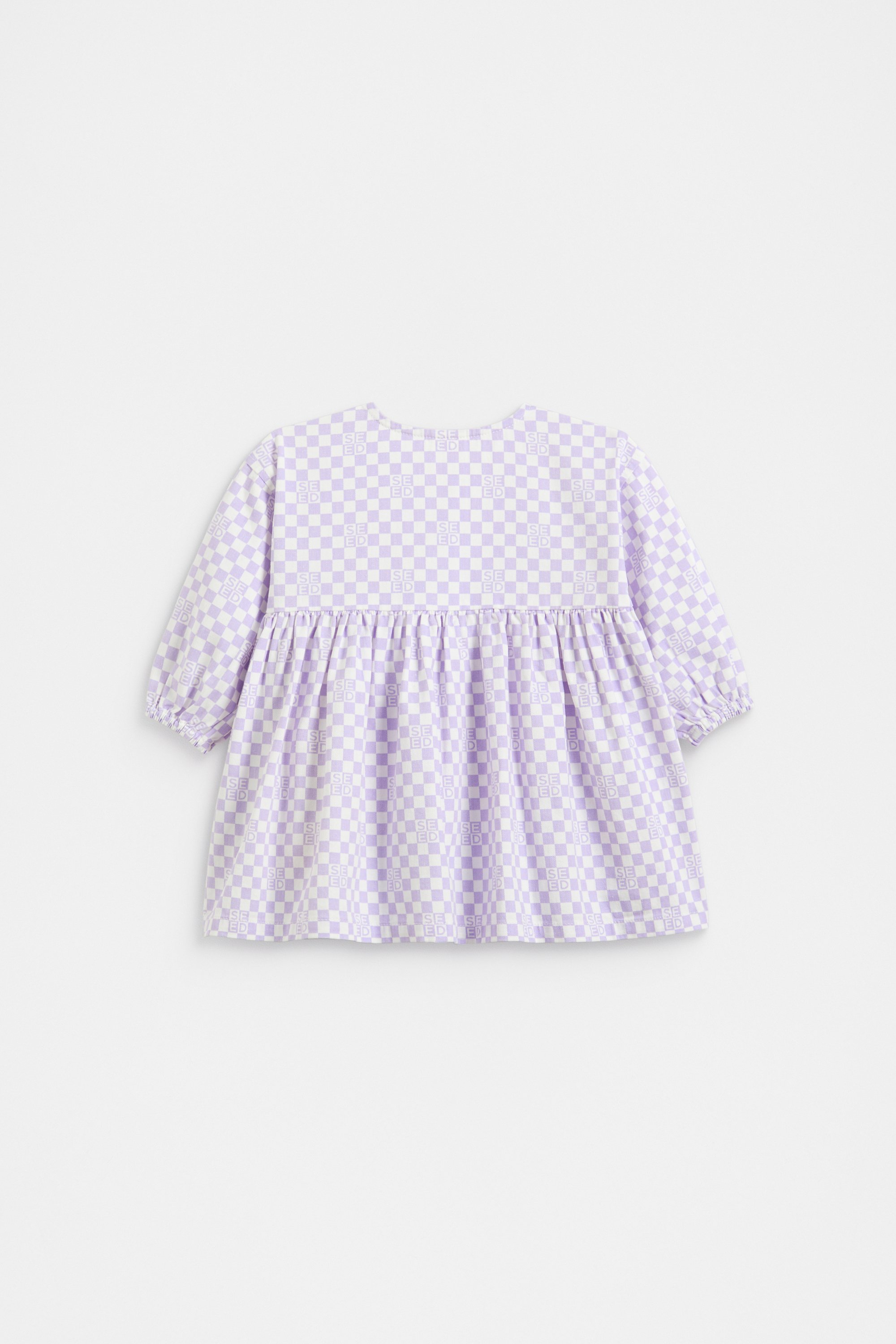Adding ease to her head-to-toe dressing, this dress is finished in a lavender check for all-over sweetness. Crafted in premium cotton, it features a round neck with a button-up detail and long sleeves with elasticated cuffs for a tidy fit. Pair with the matching check styles for a too-cute coordination.
