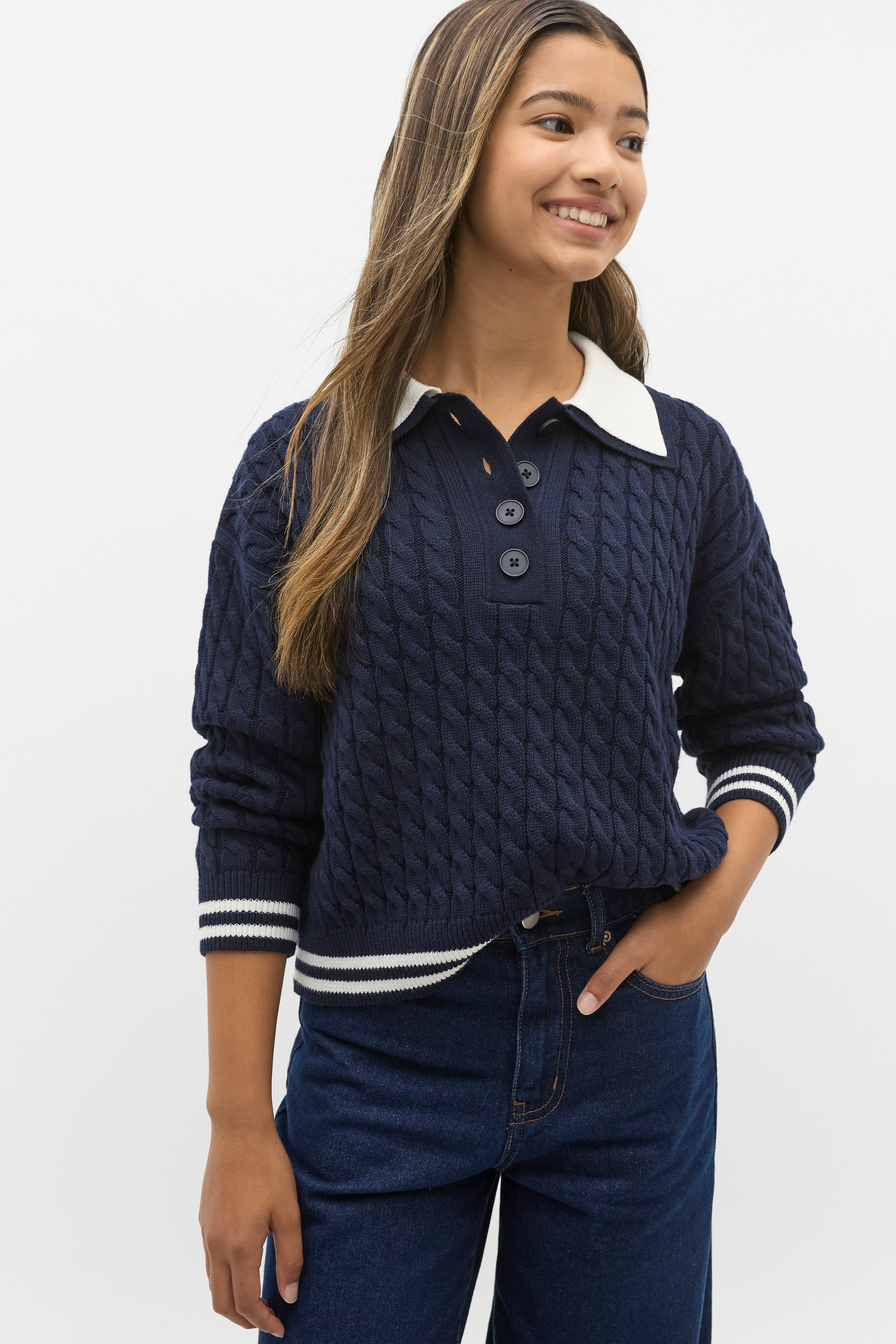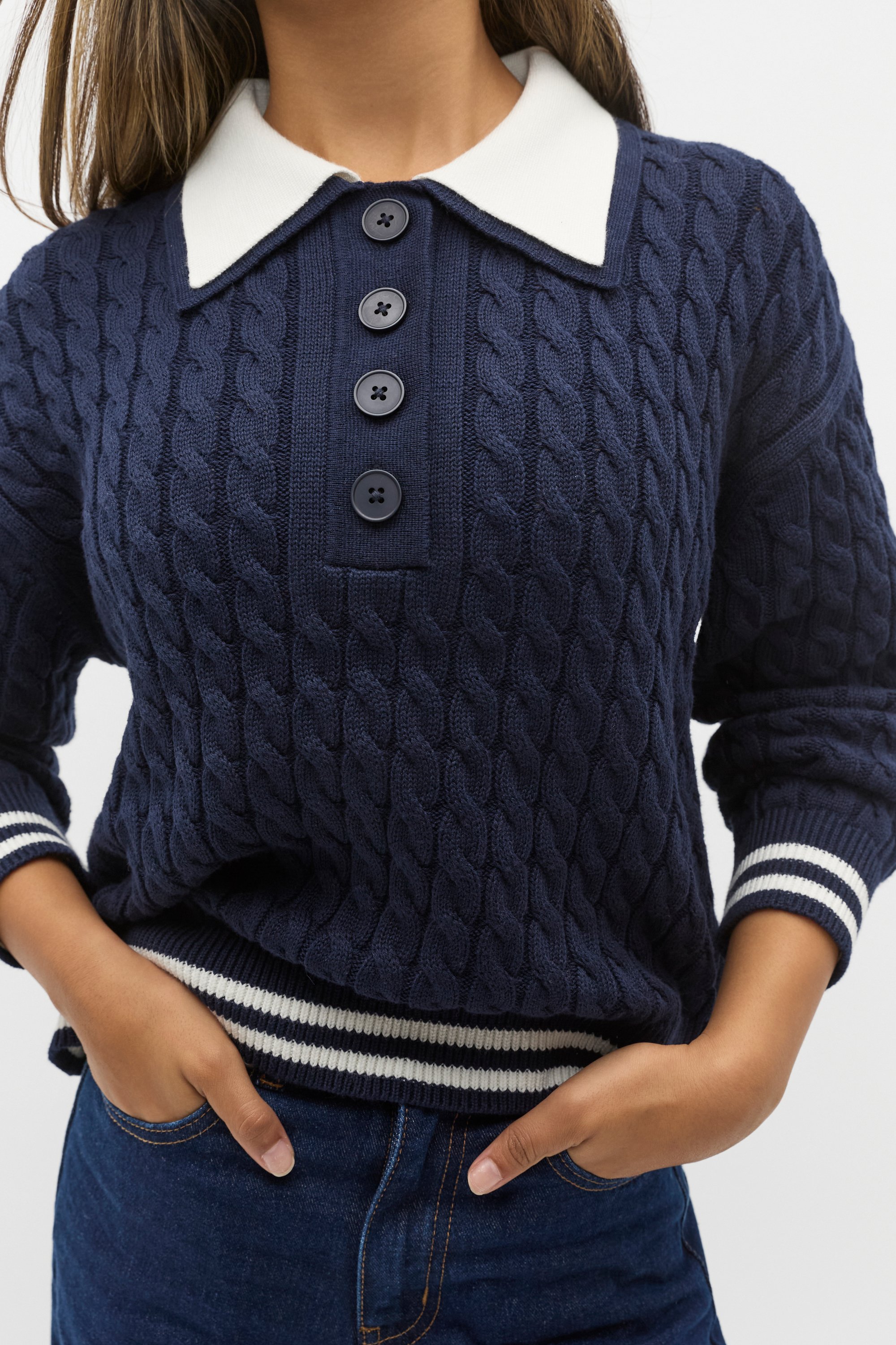 Perfect for the weekend, this knit sweater is an effortlessly chic style finished with sporting details. Crafted in a rich cotton blend, it features a button-up contrast collar, long sleeves and a cable knit finish. It's detailed with a stripe design at the trim and cuffs.