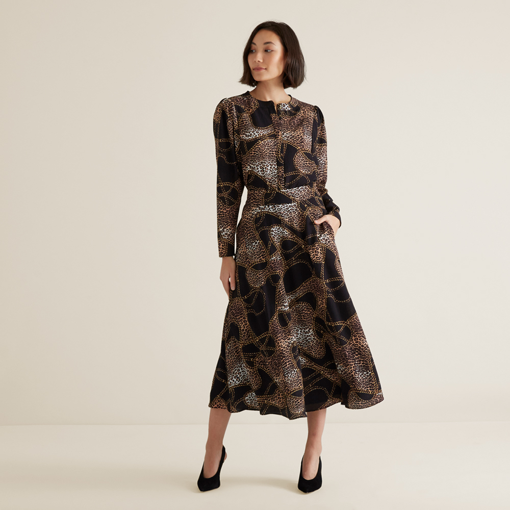 Featuring an ultra-feminine golden mixed print, this Chain Print Blouse is a statement wardrobe piece this season. It is detailed with a longline hem, circle neck collar and dainty black buttons. It is made from a lightweight Polyester/Elastane blend, available in sizes 6 through to 14. Our model wears a size 8 and is 176cm tall. Care instructions can be found inside of the garment.