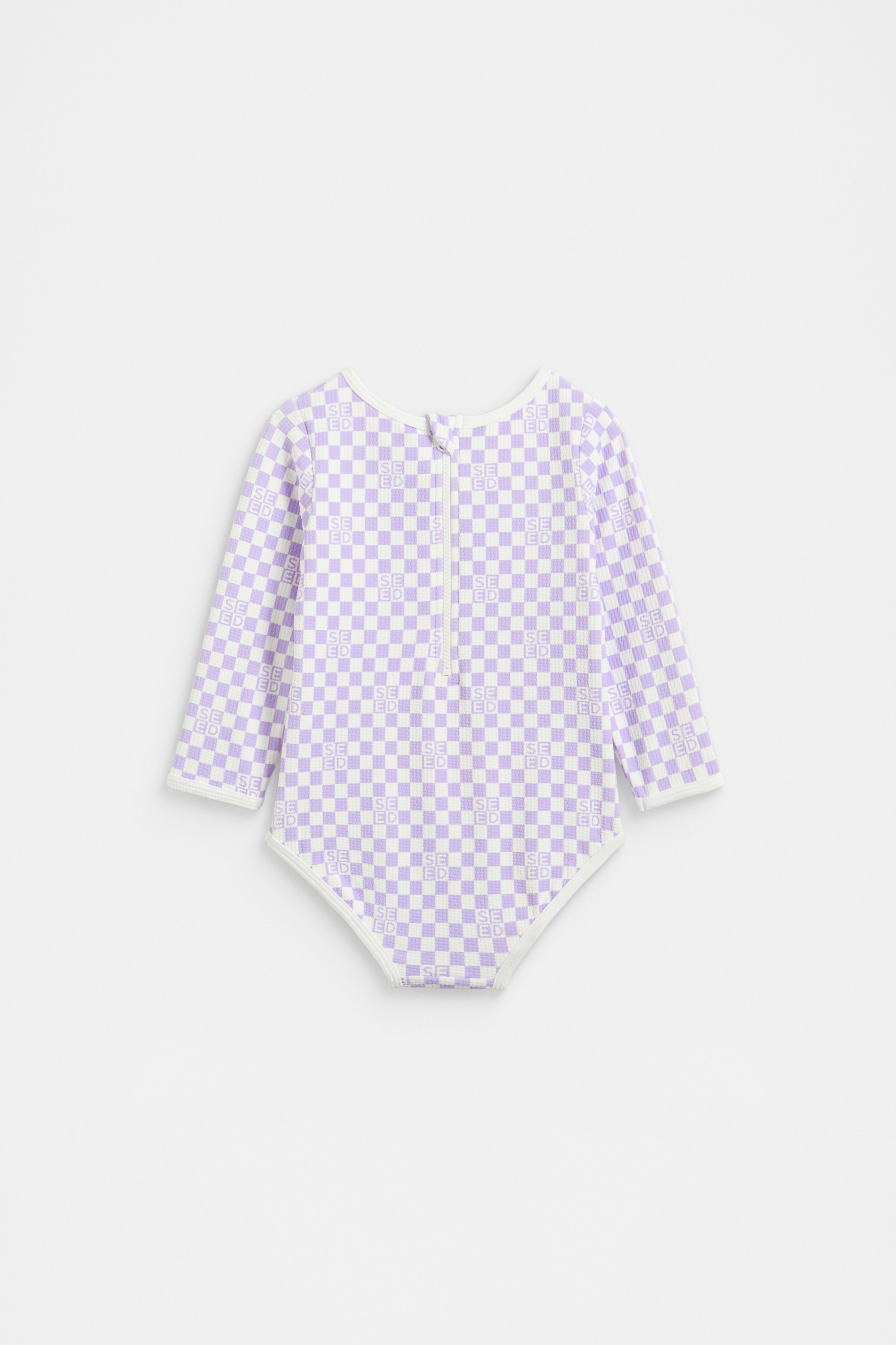 Perfect for a day at the beach or by the pool, this adorable little one-piece is ready for adventure. Finished in the sweetest lavender check design, it features a round neck, long sleeves and secures at the back with a zip.