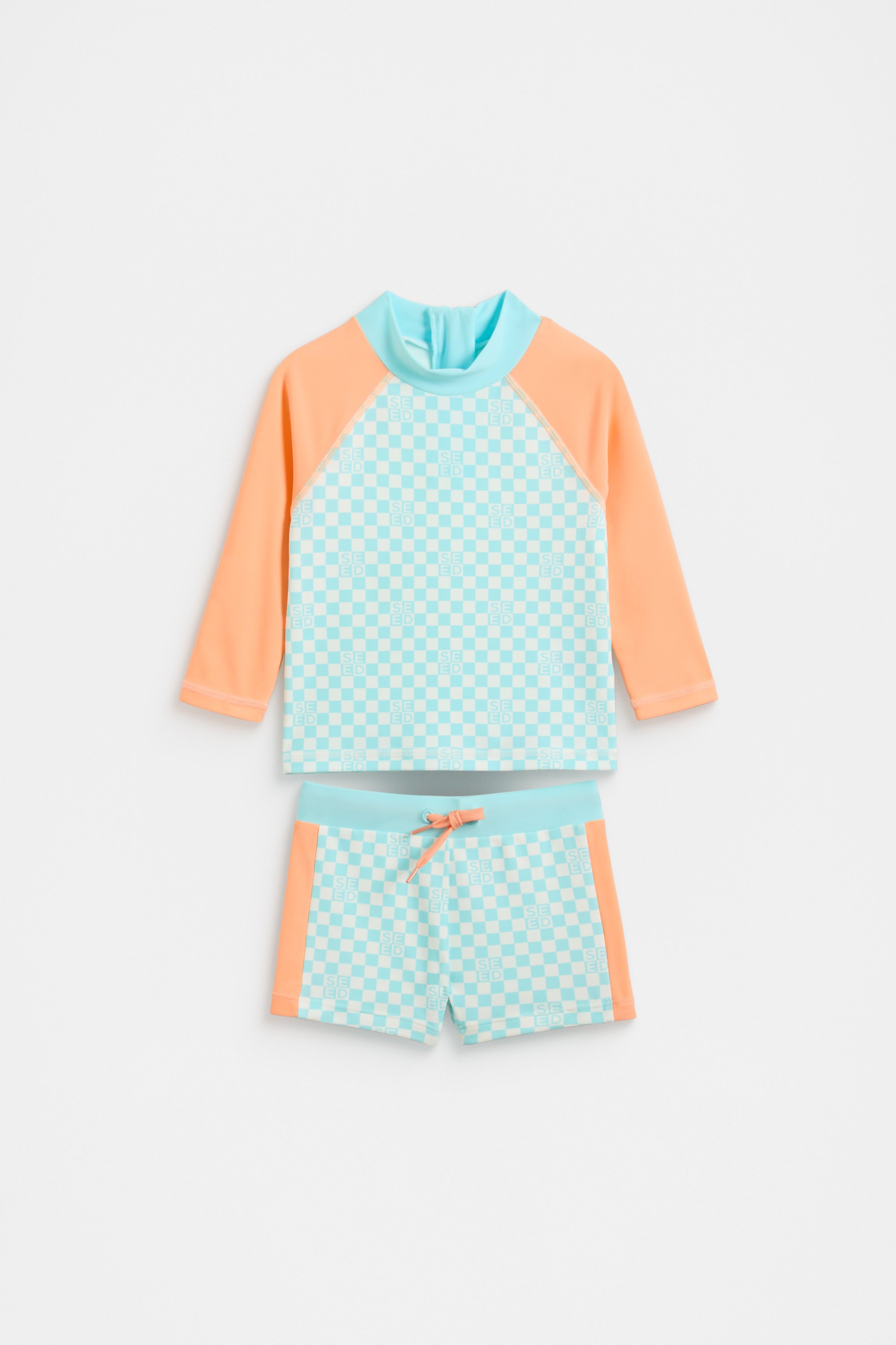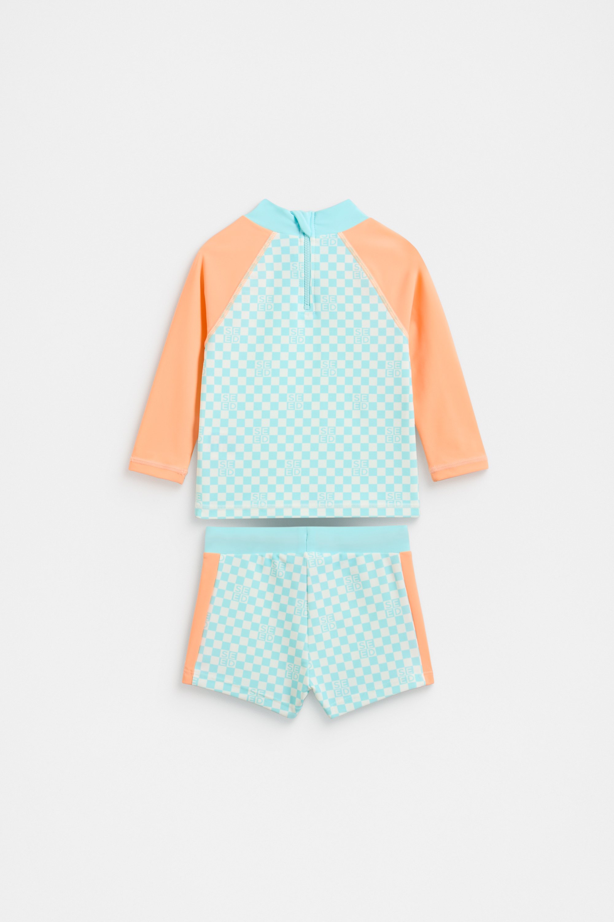 Perfect for pool-side or beach day adventures, this two-piece swim set is comfortable and ultra-cool. It includes a high neck rash vest with raglan sleeves and a rear zip and swim shorts with an elasticated waistband finished in a too-cute check design.