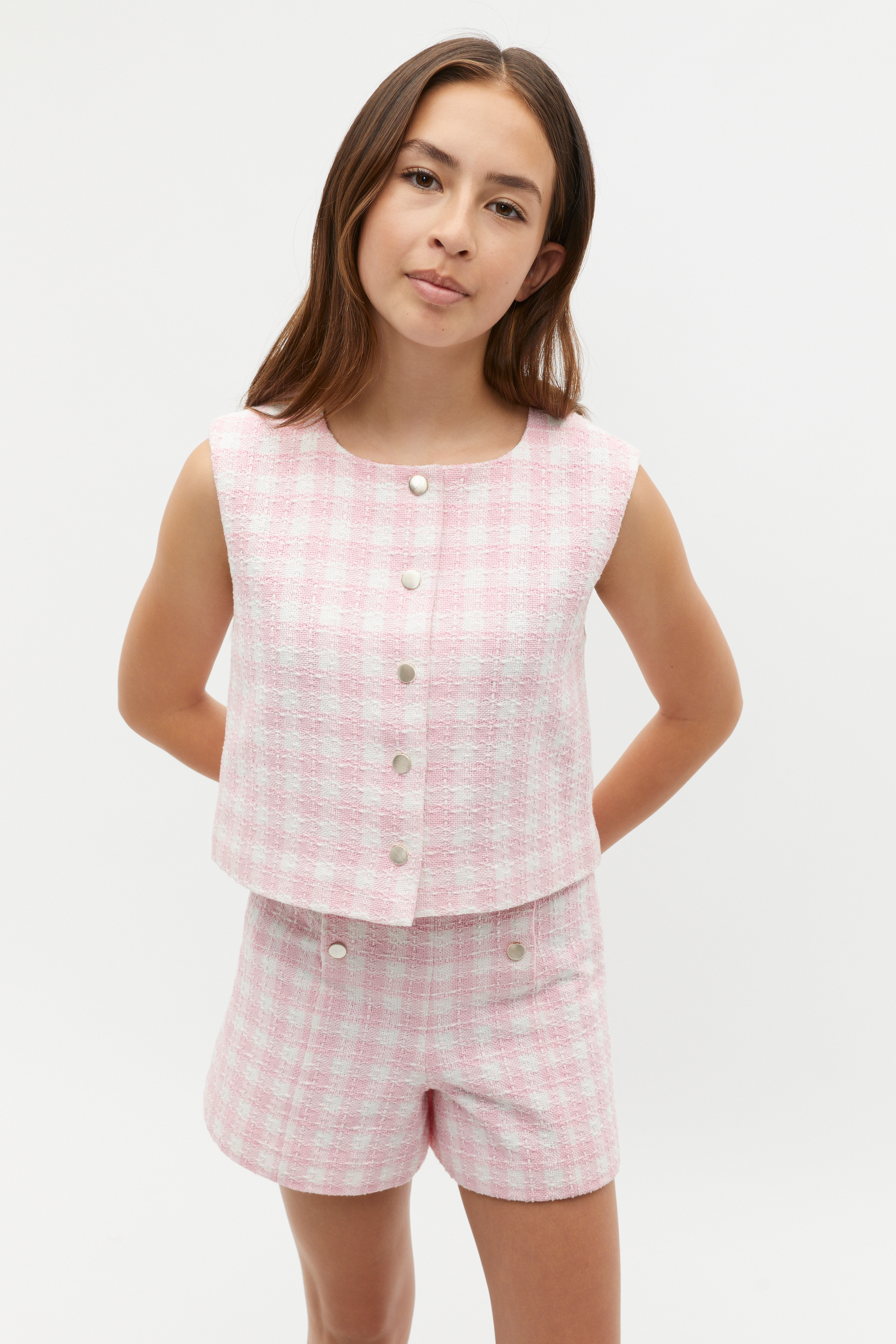 In a chic check for sophisticated styling, this waistcoat is an on-trend addition to her wardrobe. With a textured knit finish, it features a round neck, sleeveless design, button front and an all over check print. Designed to wear with the matching check shorts for an effortless coordinated look.