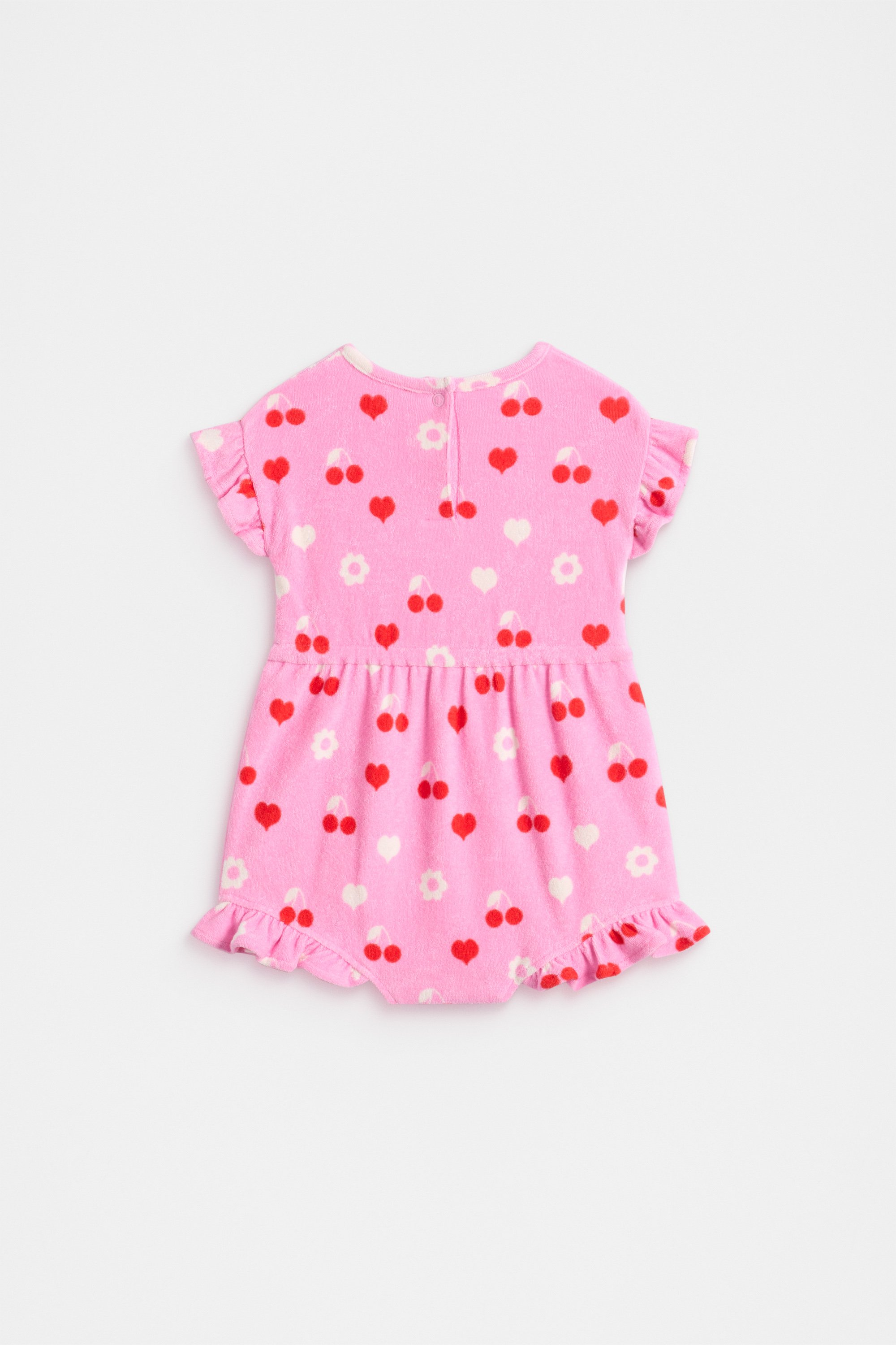 Cheerful and cute, this little romper is the perfect style to dress her up in. With a textured finish, it features a round neck, ruffle trims at the sleeves and leg openings and an elasticated waistband. It fastens with snaps at the back and at the gusset for quick and easy changes.