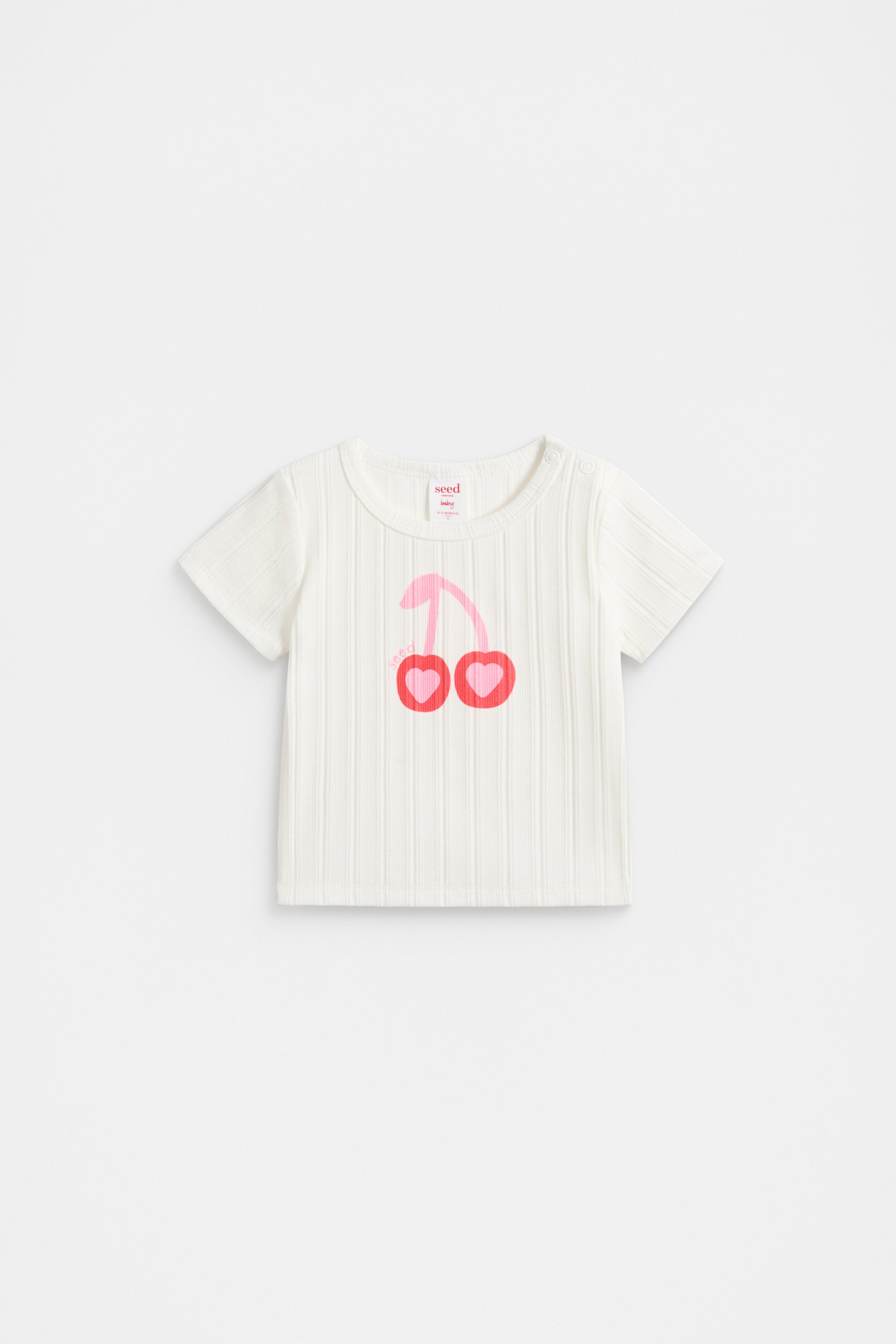 Ready for everyday wear and everyday play, this little tee is comfortable and cute. Crafted in a soft stretchy blend containing cotton, it features a round neck with shoulder snaps for easy changes, short sleeves and the sweetest cherry design across the front.