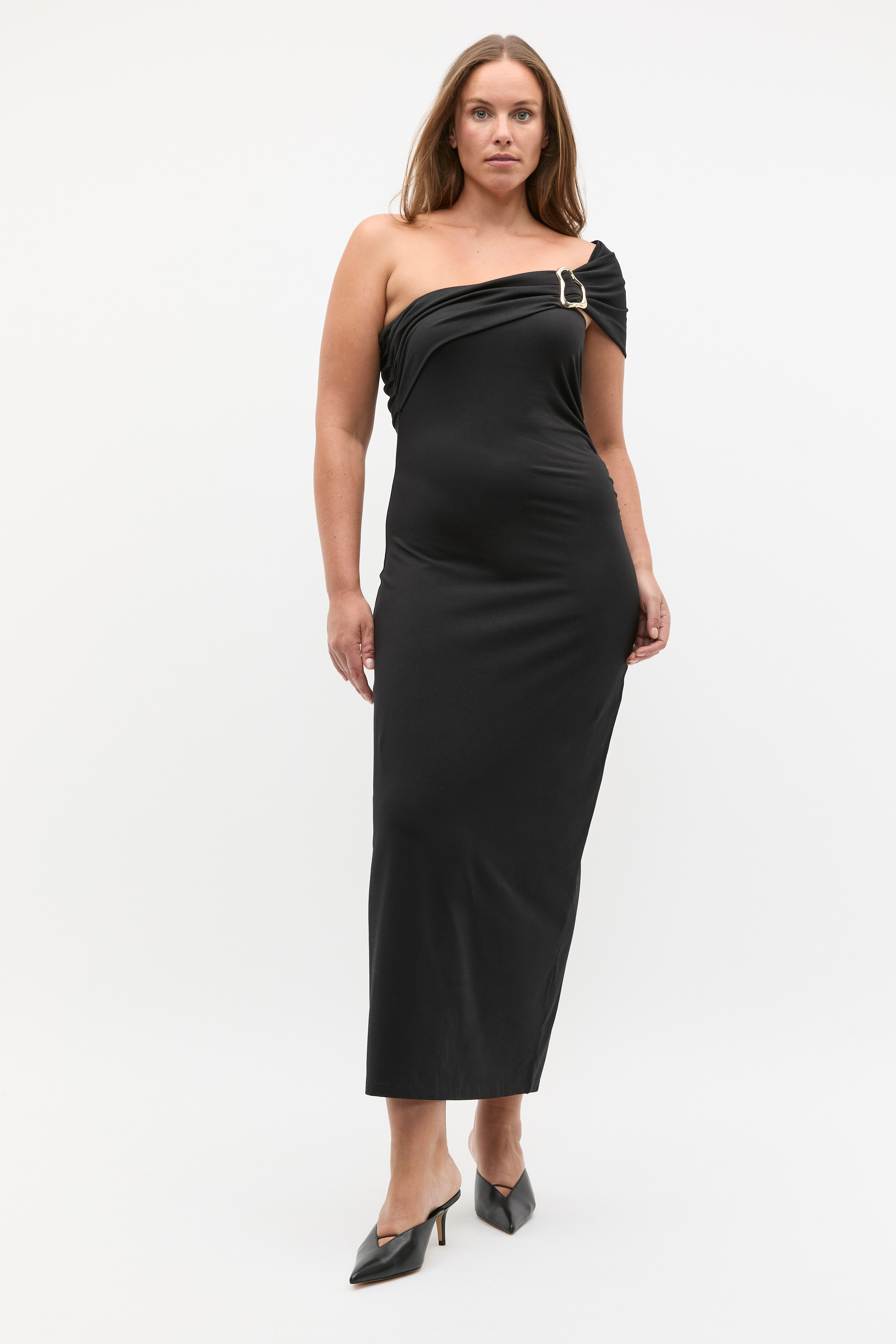 A head-to-toe look with instant impact, this dress is ready for your next event. It features a statement one-shoulder neckline accentuated with an organic gold-tone buckle, rouched details and a neat fit through the body. It falls to a midi length.