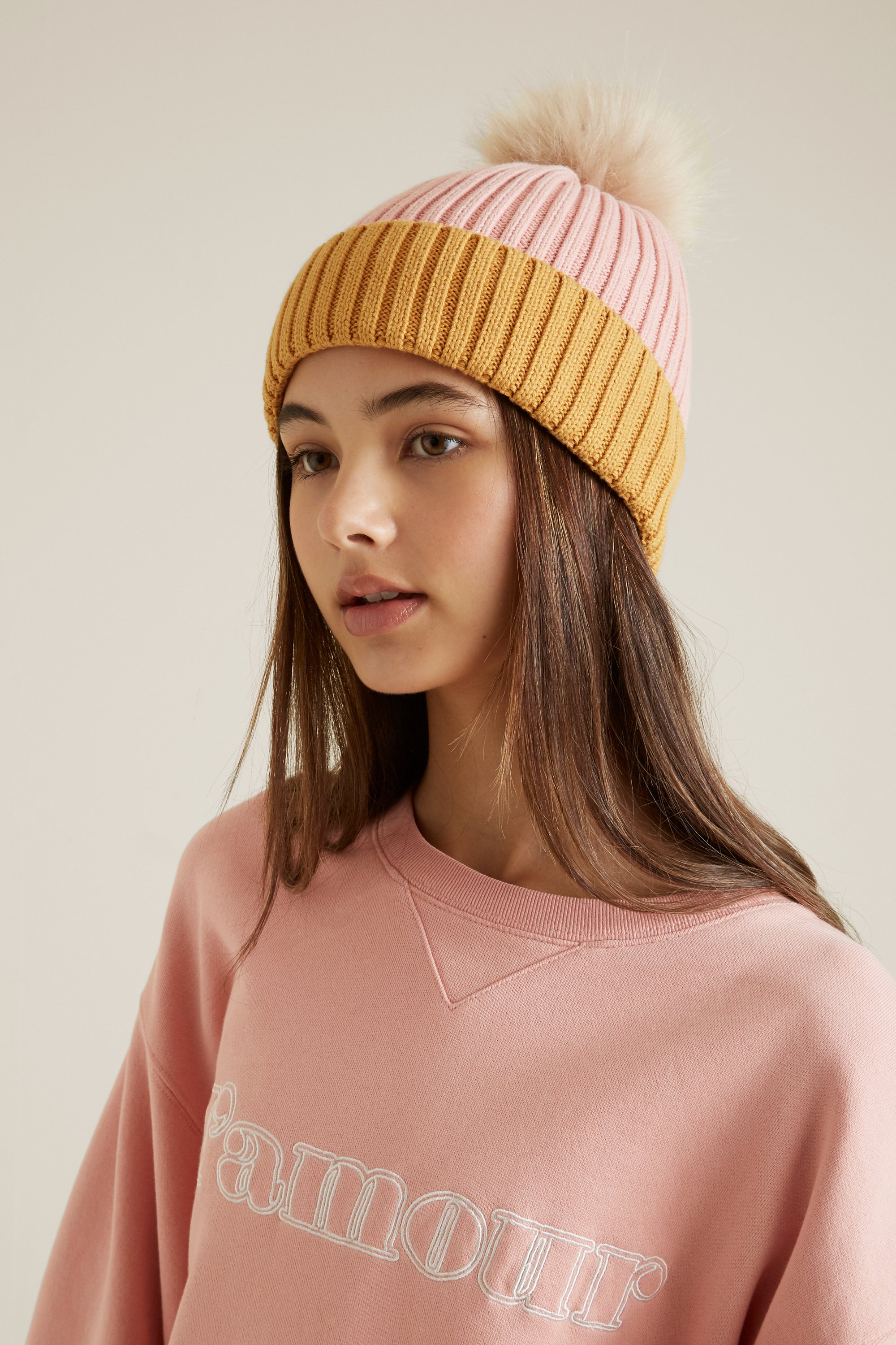 Made from a lightweight yarn, this Colour Block Beanie is detailed with a contrast flap and oversized pom pom. Check the label inside of the garment for care instructions.